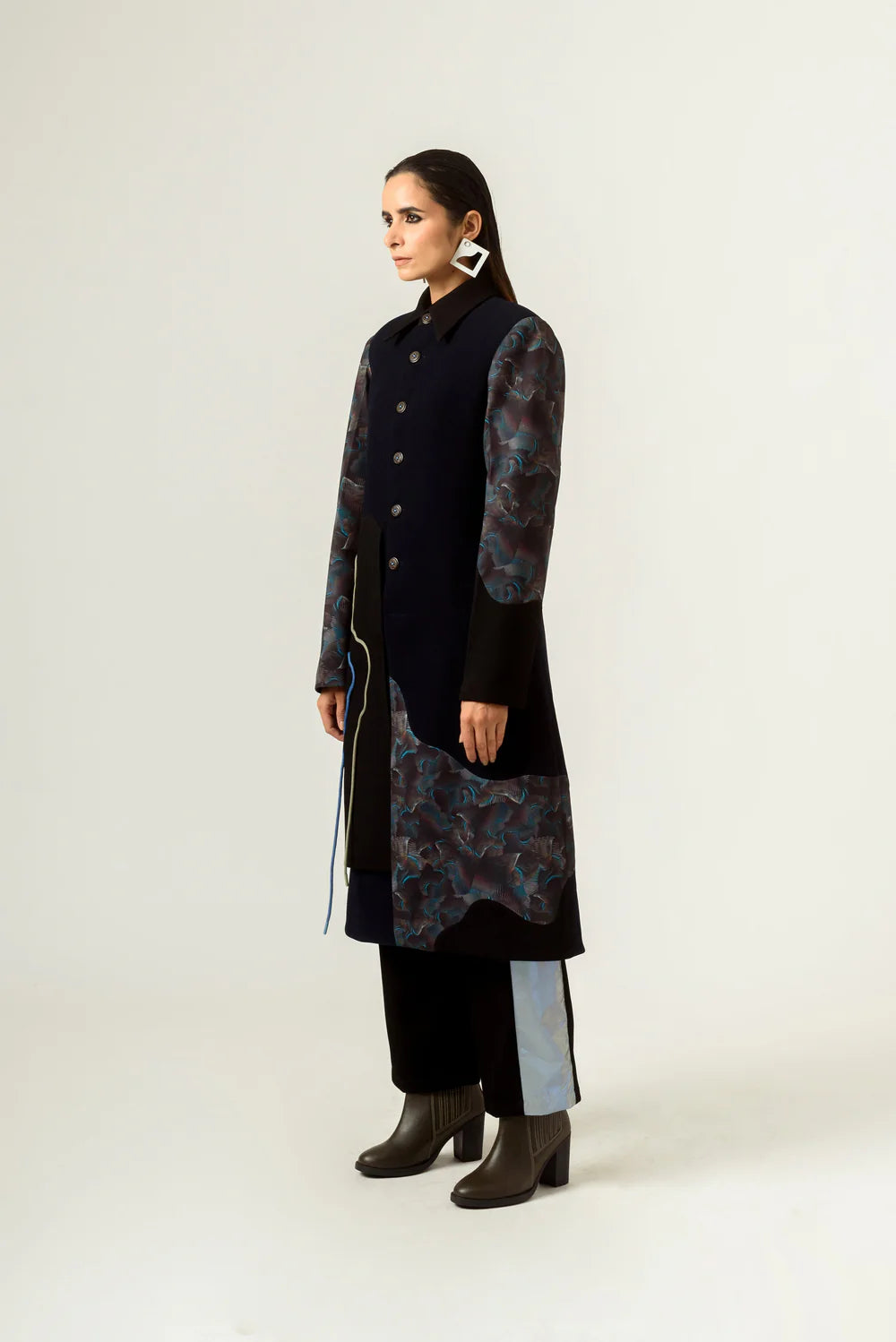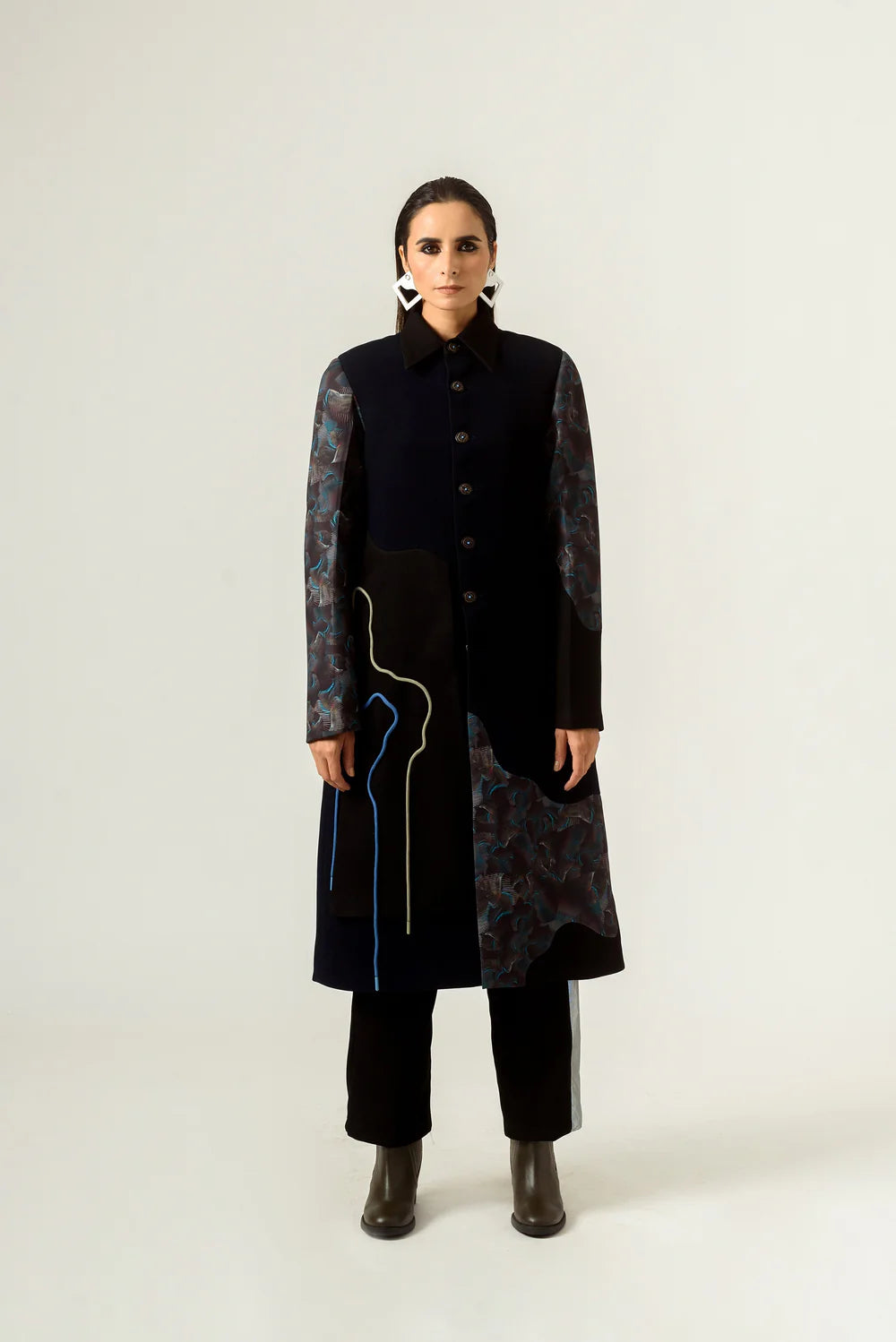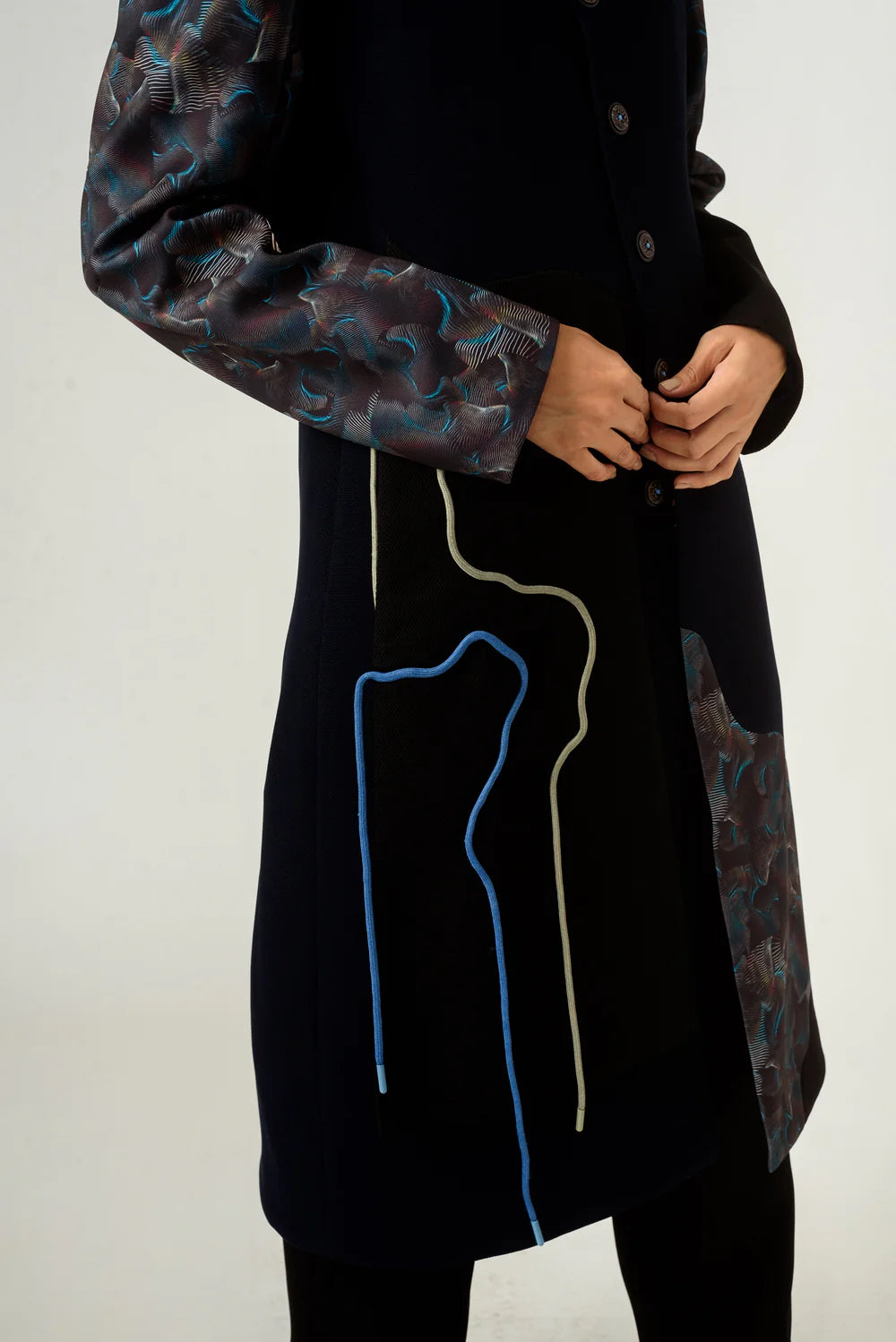 This sculptural trench redefines classic outerwear with tactile pattern and artisan detail. Cut in deep navy textured crepe, it’s accented by dynamic panels of agitation-print Lycra and trimmed with jet-black knit crepe enriched by hand-embroidered rope detailing. The result is a relaxed silhouette that blends structure with fluid artistry