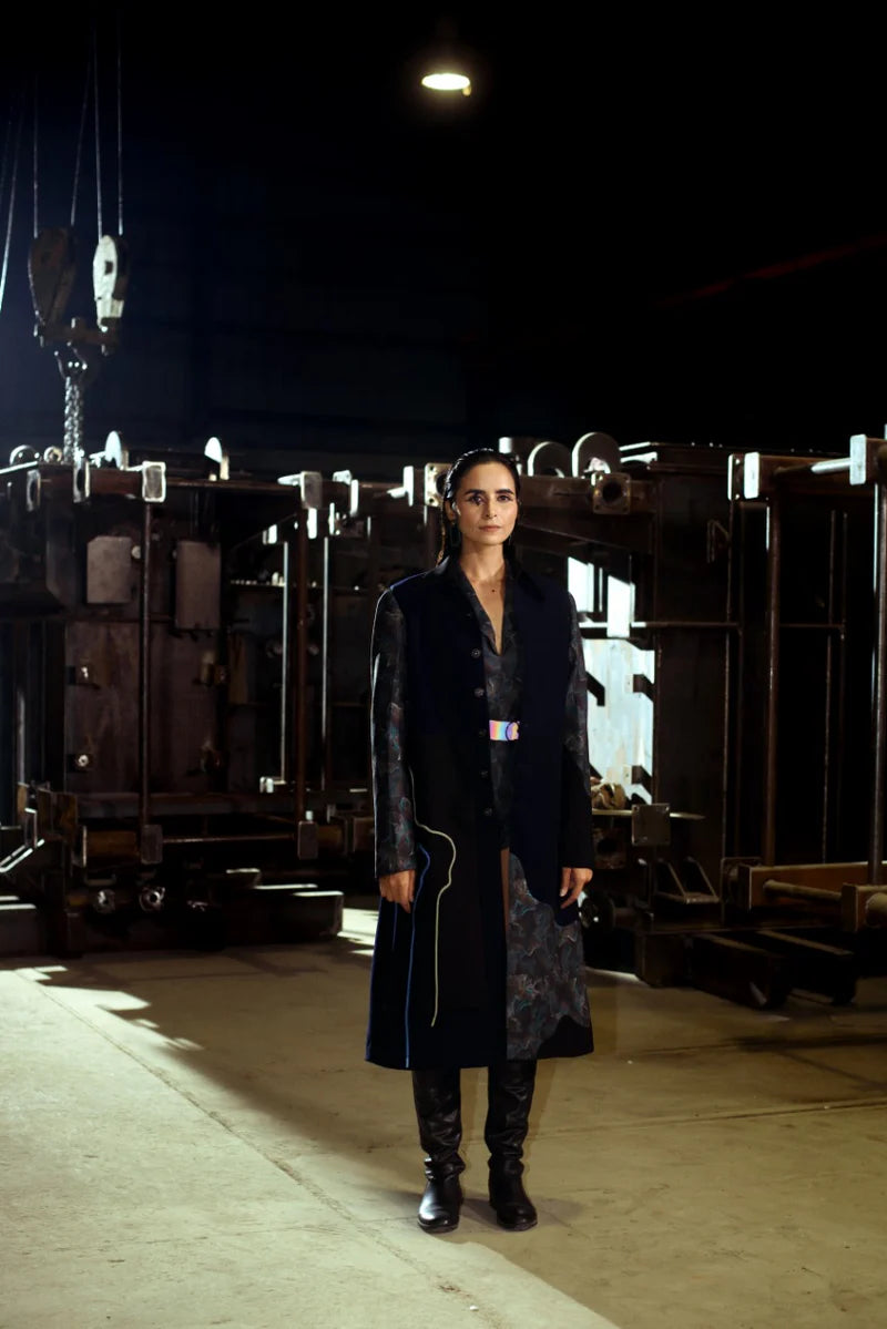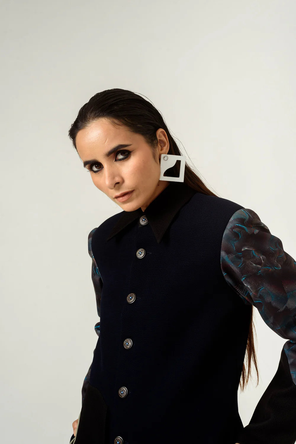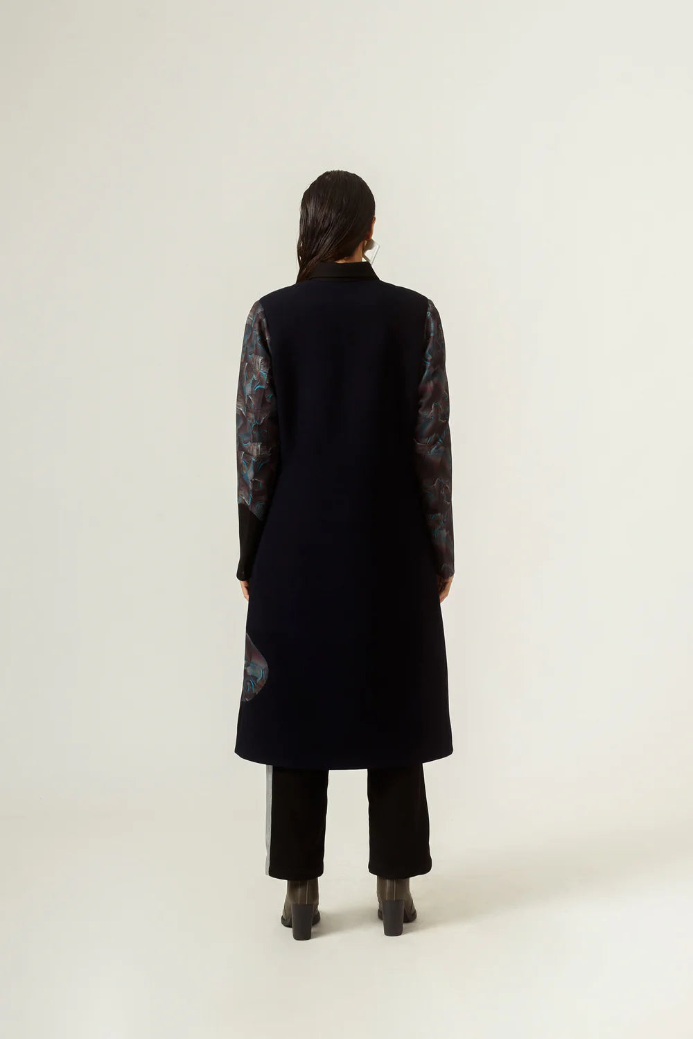 This sculptural trench redefines classic outerwear with tactile pattern and artisan detail. Cut in deep navy textured crepe, it’s accented by dynamic panels of agitation-print Lycra and trimmed with jet-black knit crepe enriched by hand-embroidered rope detailing. The result is a relaxed silhouette that blends structure with fluid artistry