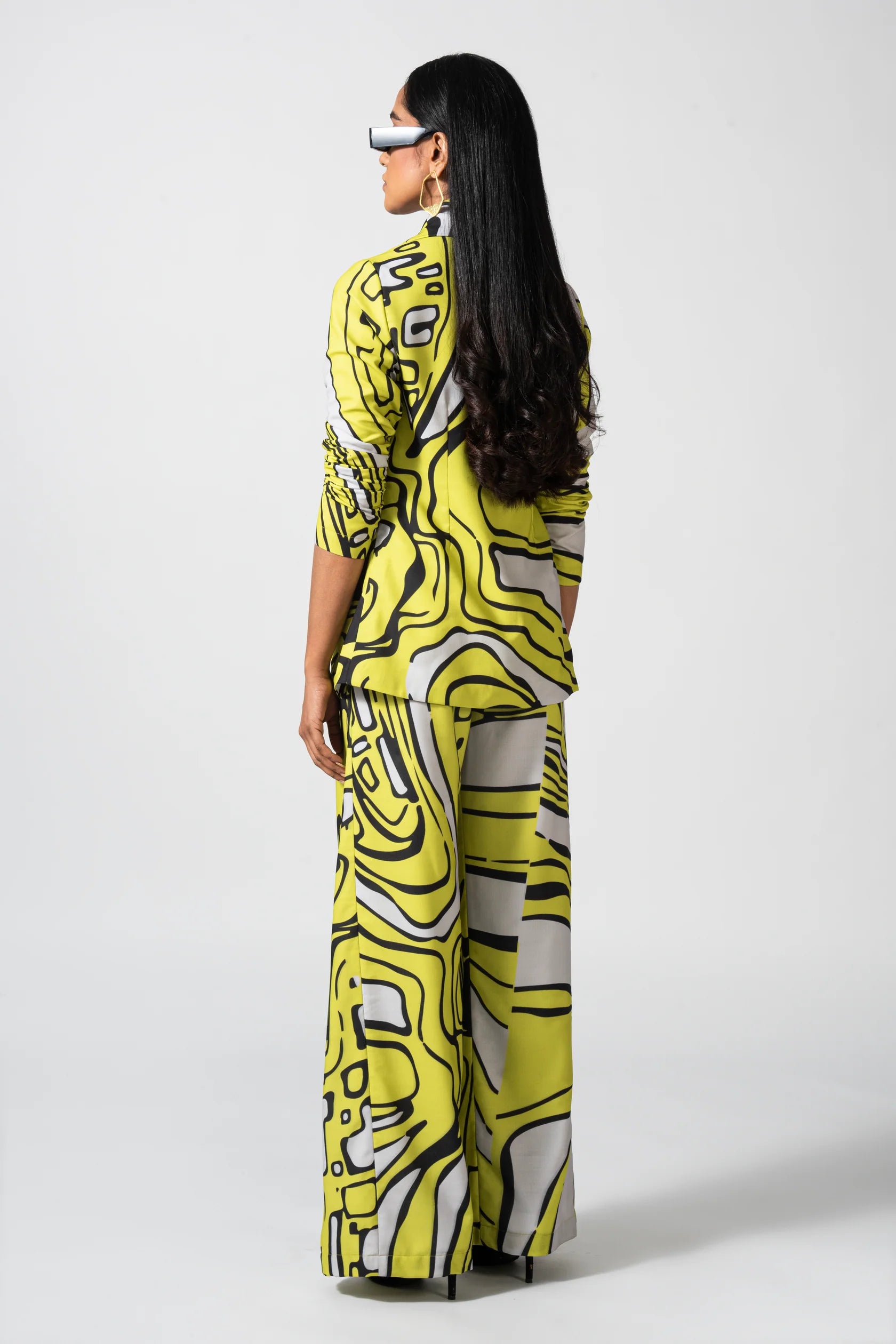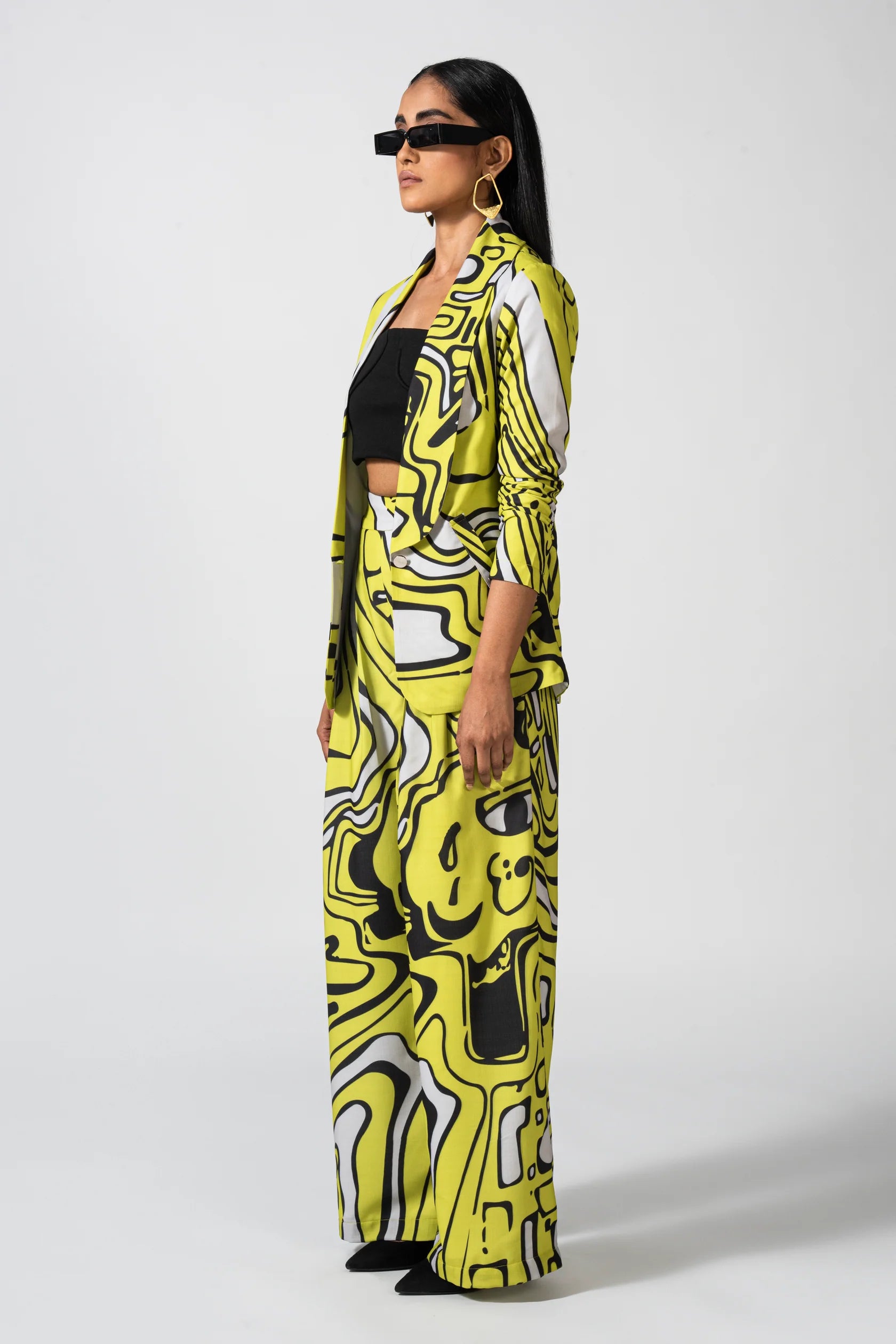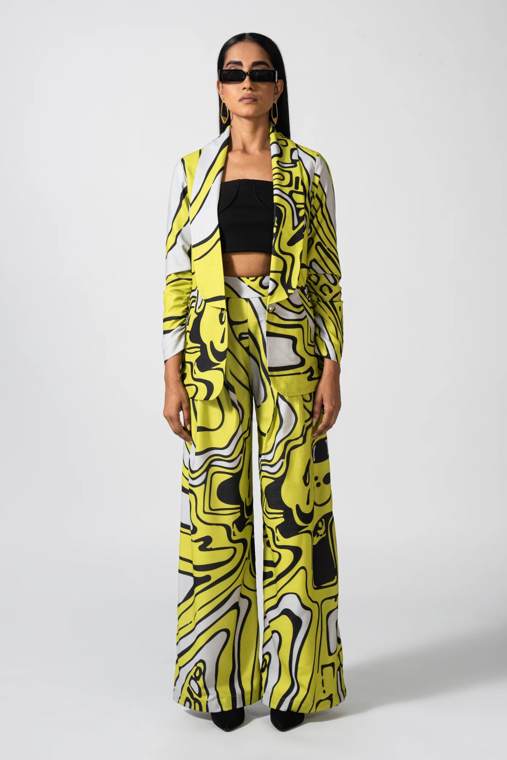 The Allegro Espression Wide-Leg Pants are a bold fusion of structured tailoring and playful artistry. Crafted in premium Inbox poplin, these trousers offer a high-rise waist and floor-grazing length for dramatic impact. The standout, hand-drawn “funny face” print in lighthearted hues infuses personality into every ensemble, transforming classic wide-legs into a statement piece.