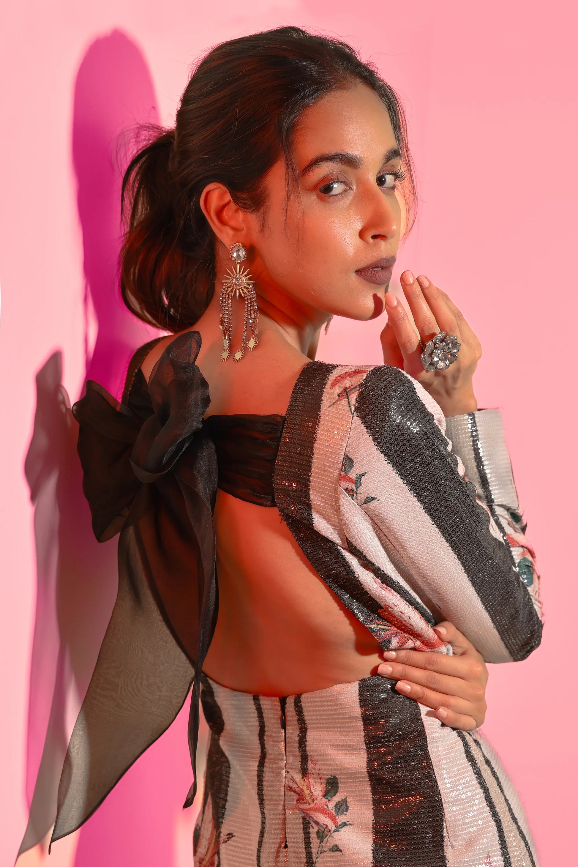 Black and beige printed sequin fitted mini dress with power shoulders and deep back neck with a big black organza bow.