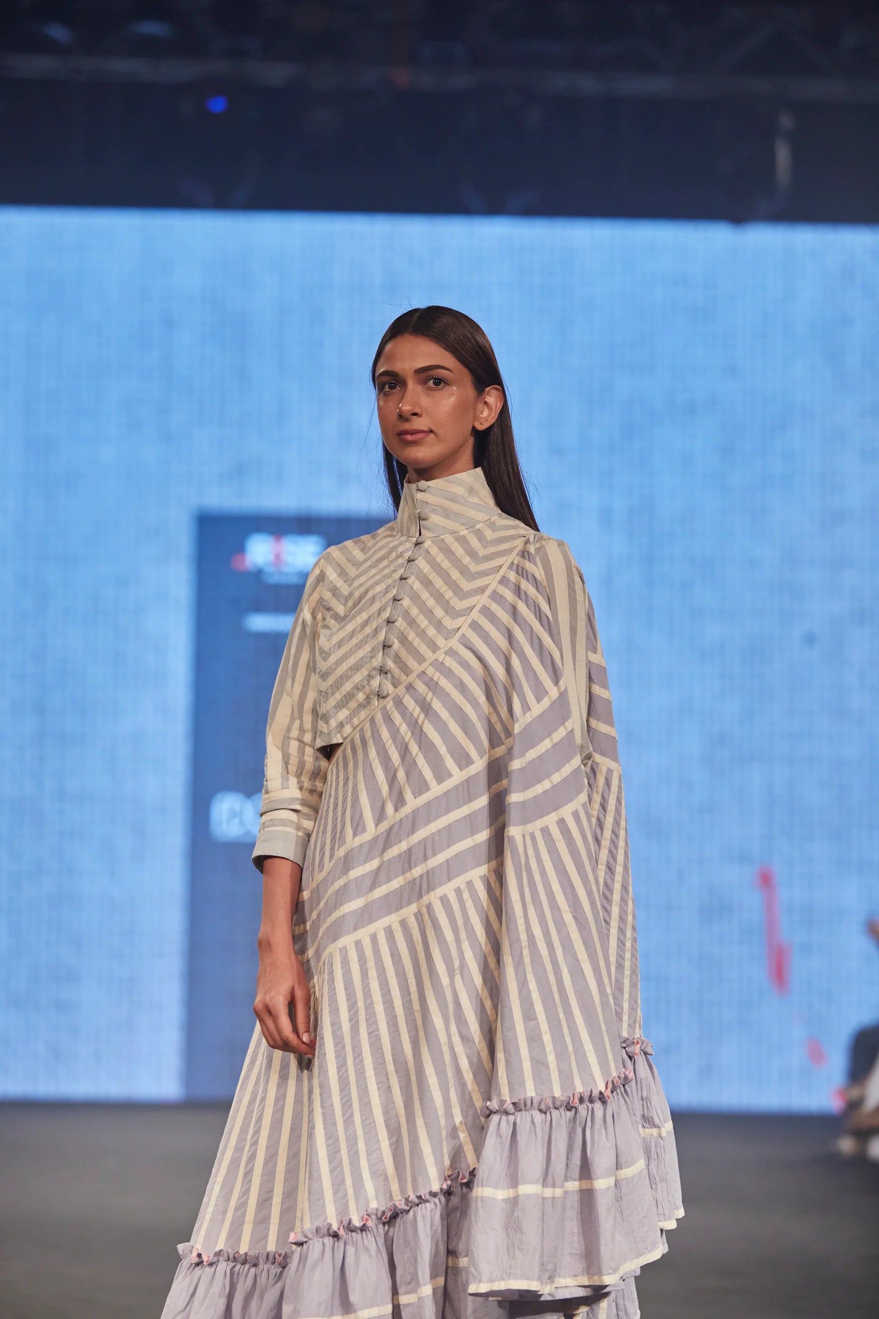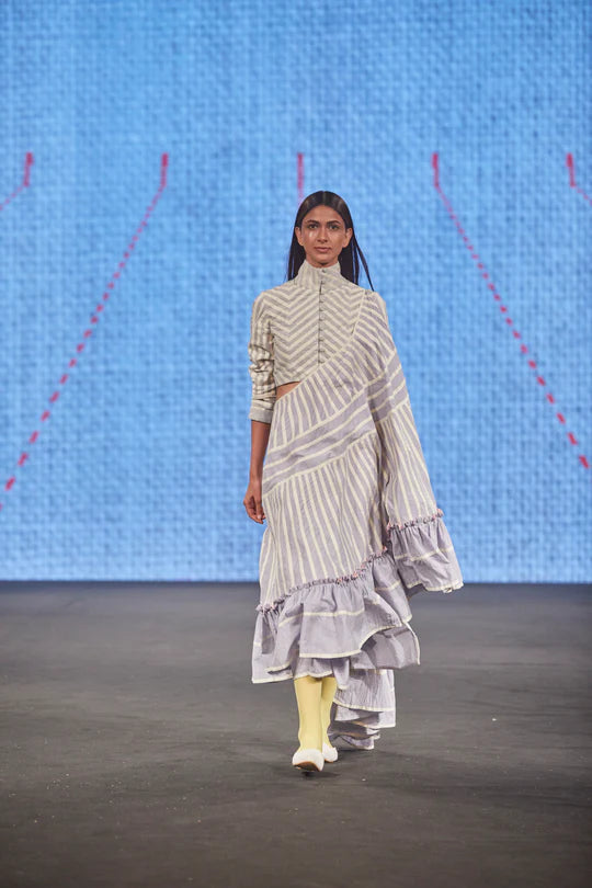 The Amba Crop is a handcrafted statement piece—its fitted silhouette adorned with hand-dyed, monochrome appliqué patterns that carve geometric elegance into organic cotton. The high neck seamlessly melds with loop-button closures.