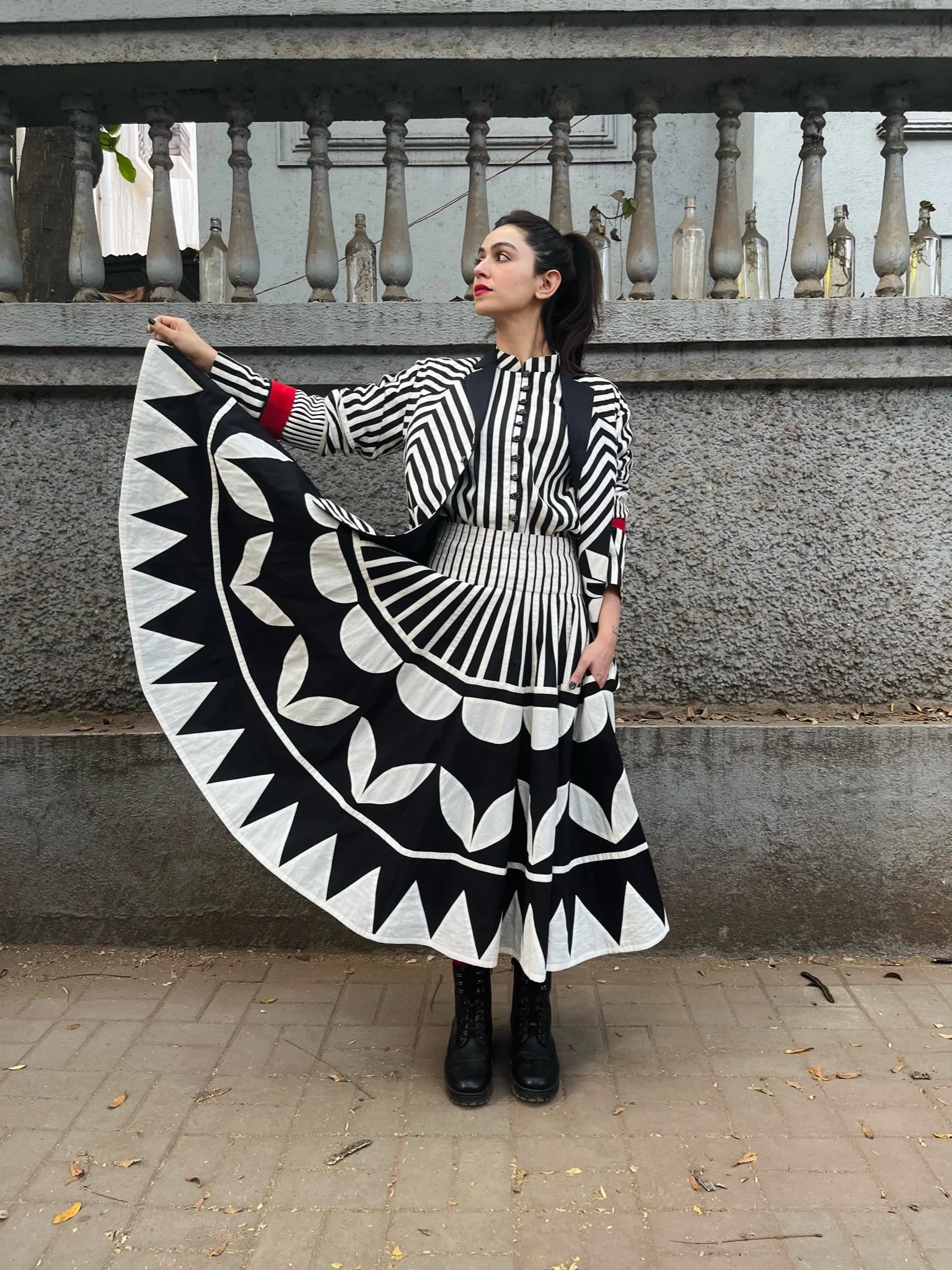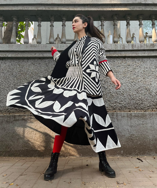 A striking fusion of traditional craftsmanship and contemporary design. This midi skirt features bold black and white appliqué patterns, creating a dynamic visual narrative that commands attention. Crafted from premium cotton, the skirt offers both comfort and structure, making it an ideal choice for upscale events or artistic gatherings. Its flared silhouette and intricate detailing reflect a commitment to quality and individuality, ensuring you stand out in any setting.