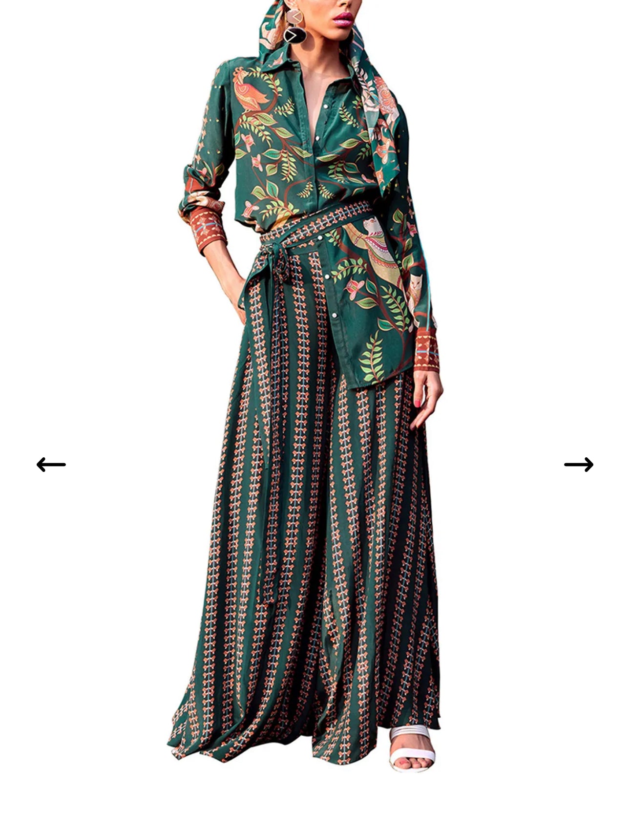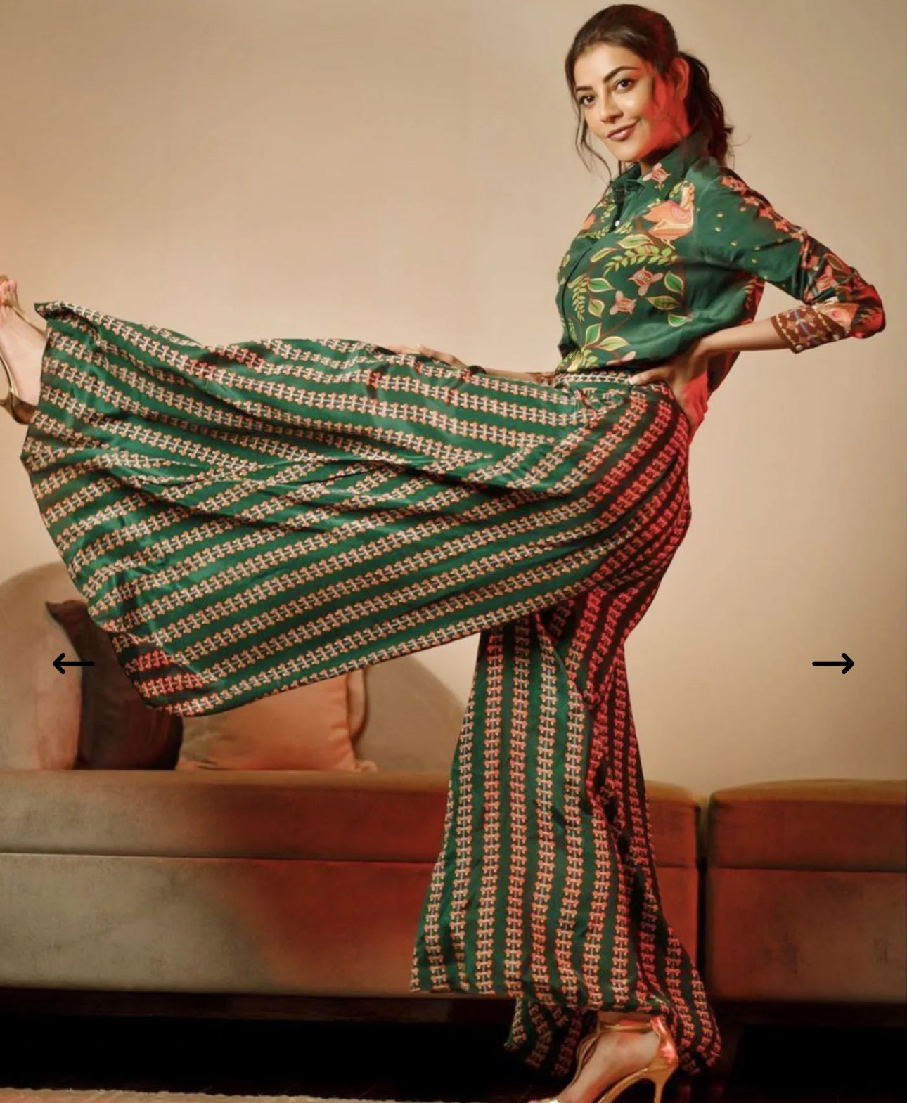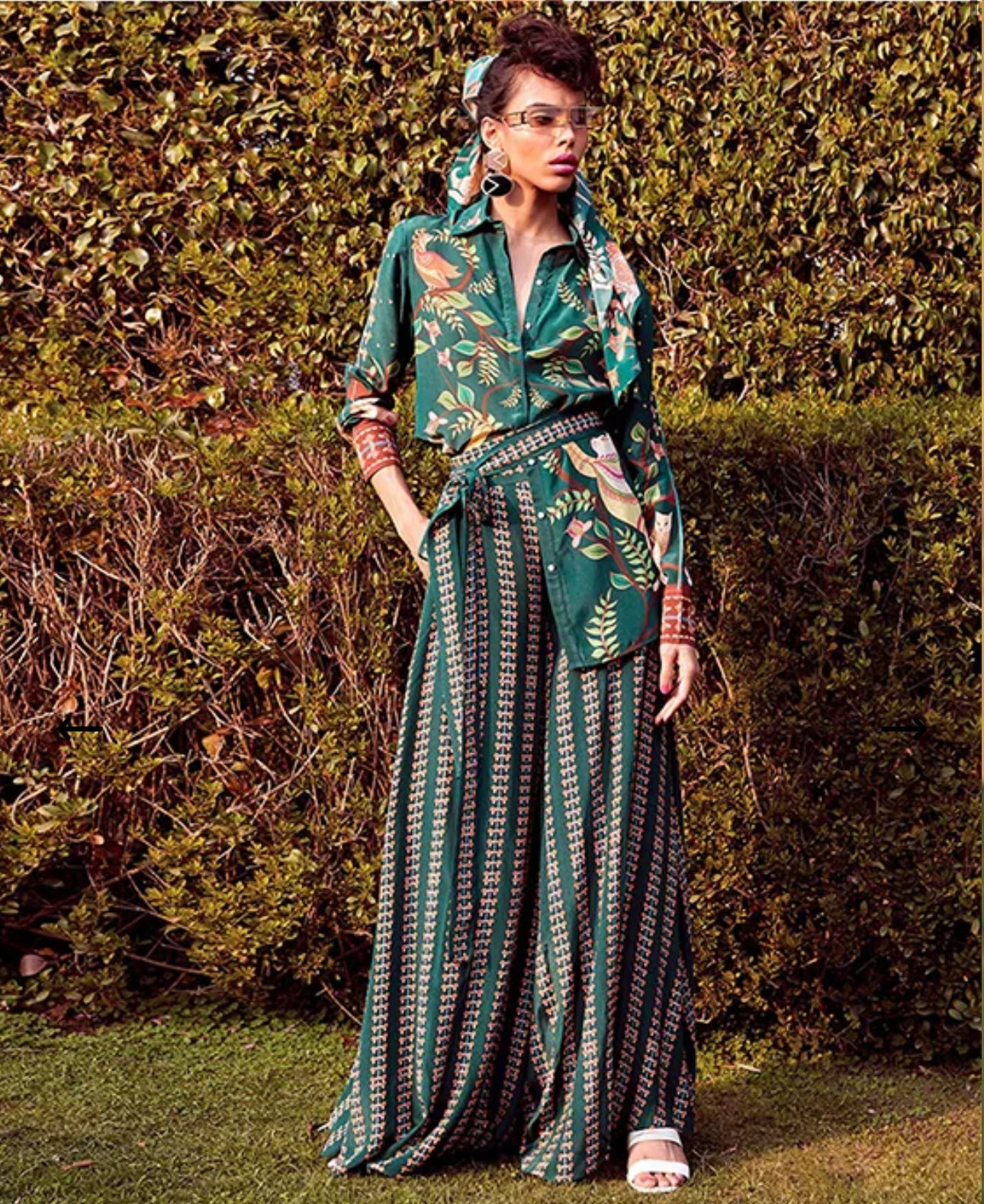 These trousers are crafted in flowing crepe with a relaxed wide-leg silhouette that drapes with comforting ease. Signature hand-inspired placement prints elongate the form with visual rhythm, while the vibrant emerald hue anchors it in understated elegance. Designed for movement and story, they combine cultural narrative with modern ease.