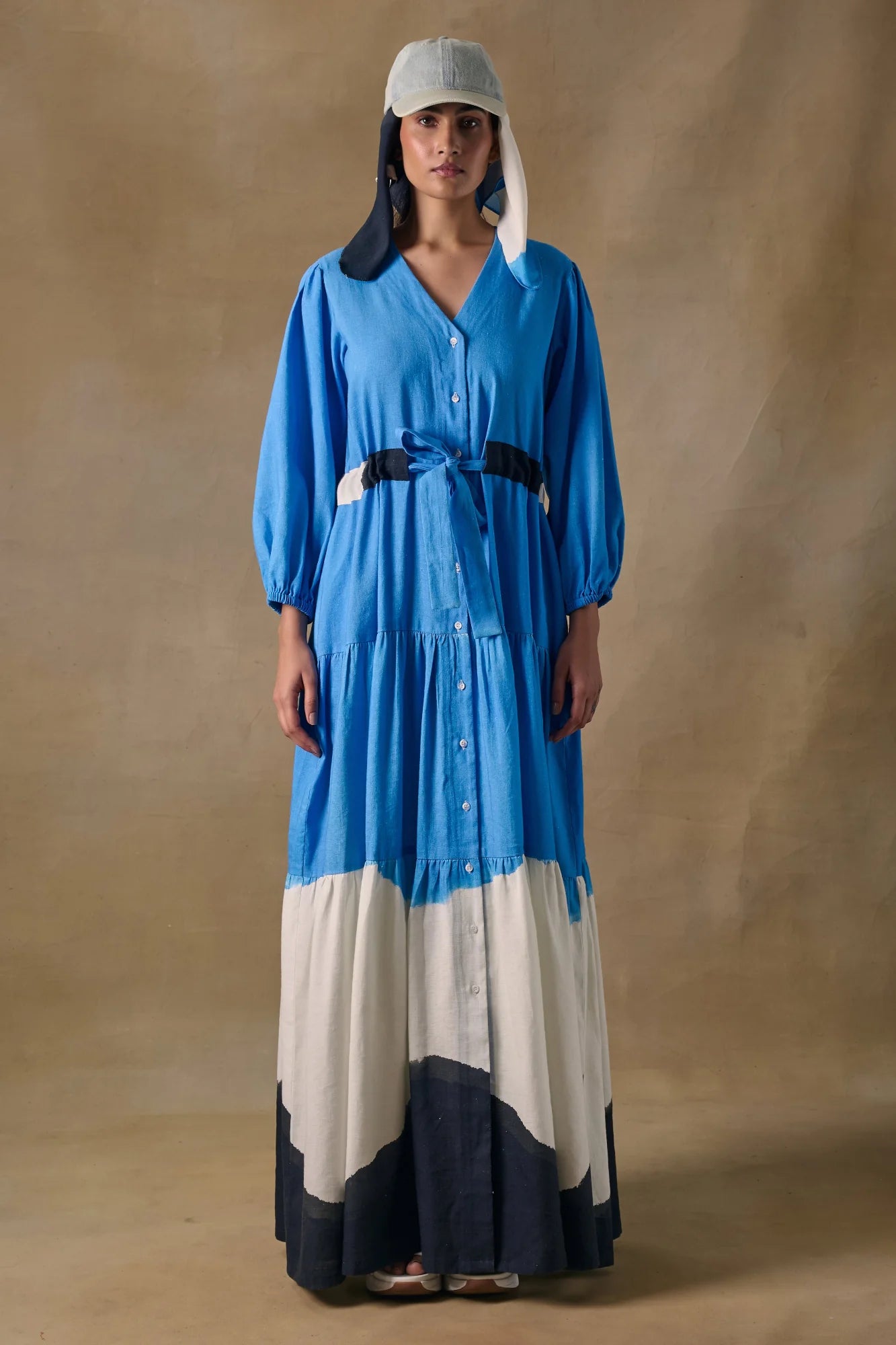The Blue Washed Tiered Dress is a breezy, statement-making piece inspired by coastal hues and crafted with artisanal intent. Made from breathable cotton flex, this maxi-length silhouette features a hand-dyed blue bodice cascading into cream and ink-washed tiers—mimicking waves meeting shore.