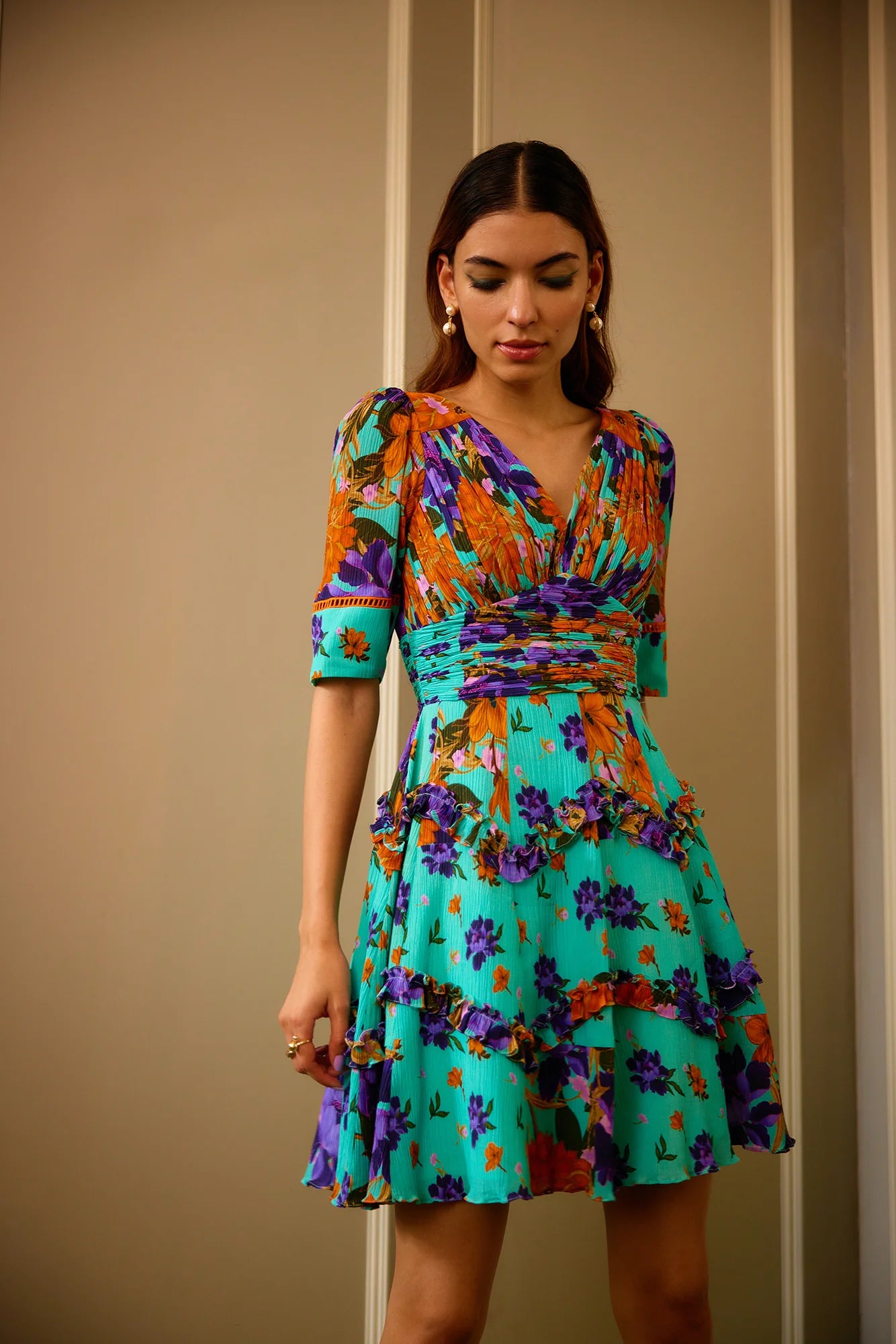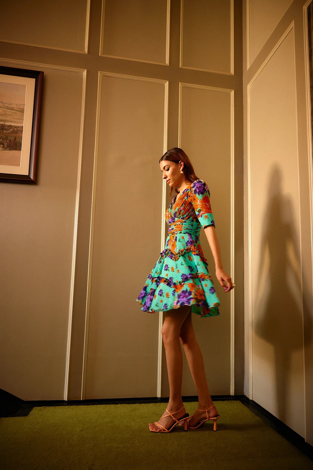 Turquoise floral mini dress with hand pleated bodice and panelled Kali dress adorned with high low frill running throught out the flare. It has deep back neck with drawstringes and our signature tassels.