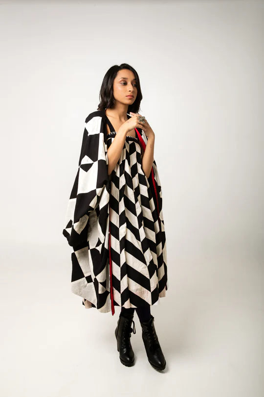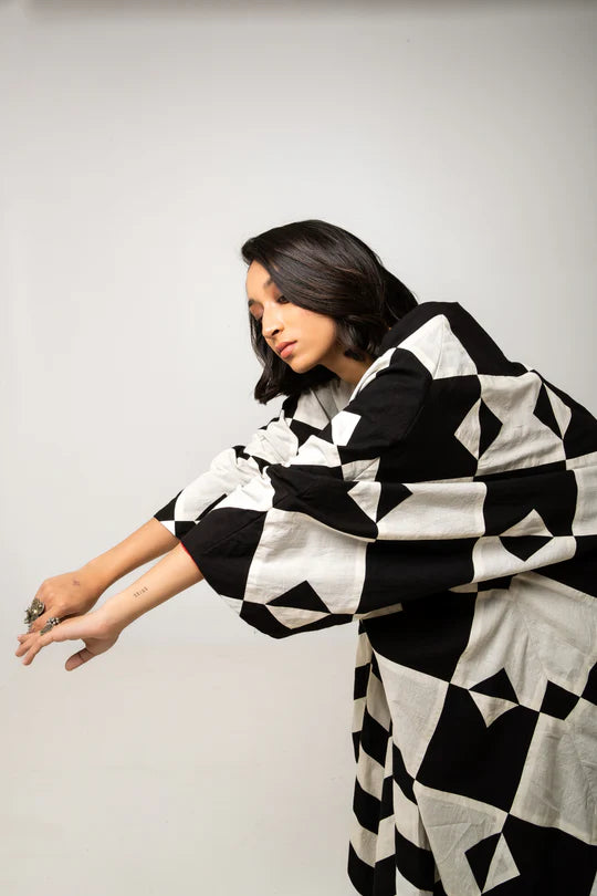 Introducing the Doma Jacket—a harmonious blend of traditional craftsmanship and contemporary design. This oversized overlay features striking geometric appliqué patterns, meticulously hand-dyed to create a bold visual statement. Crafted from premium cotton, the jacket offers both comfort and structure, making it an ideal choice for upscale events or artistic gatherings.