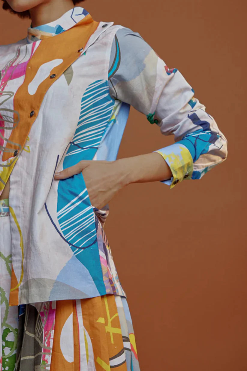 Tailored with intention, the shirt features a striking cross-placket neckline, a gently asymmetric hem, and a mandarin collar that frames the face with understated charisma. Side pockets tucked seamlessly into the silhouette balance form with function, while the fluid drape of the fabric evokes ease and confidence in equal measure.