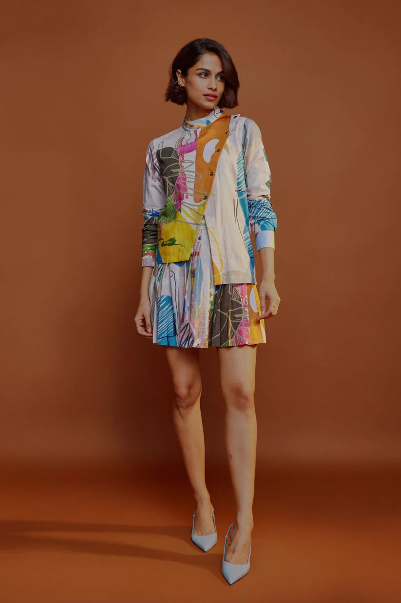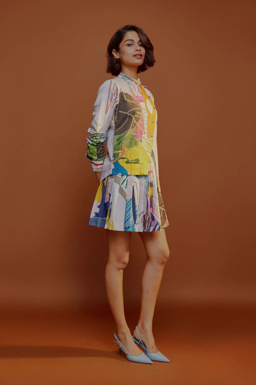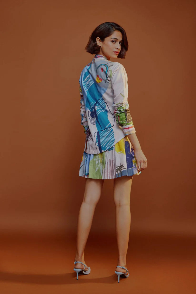 This pleated mini skirt channels the spirit of classic tennis silhouettes with a sculptural edge. Cut in clean knife pleats, the “Doodle” print adds playful texture and artistic energy without overpowering form. It’s compact, confident, and ideal as both a standalone statement bottom or a pairing piece.