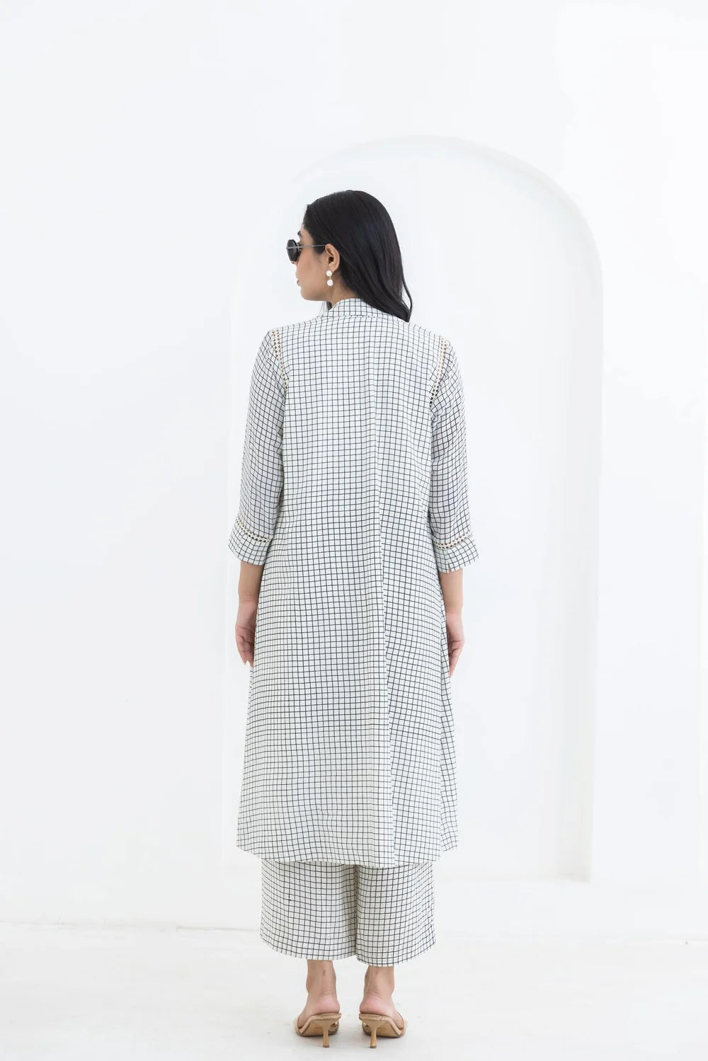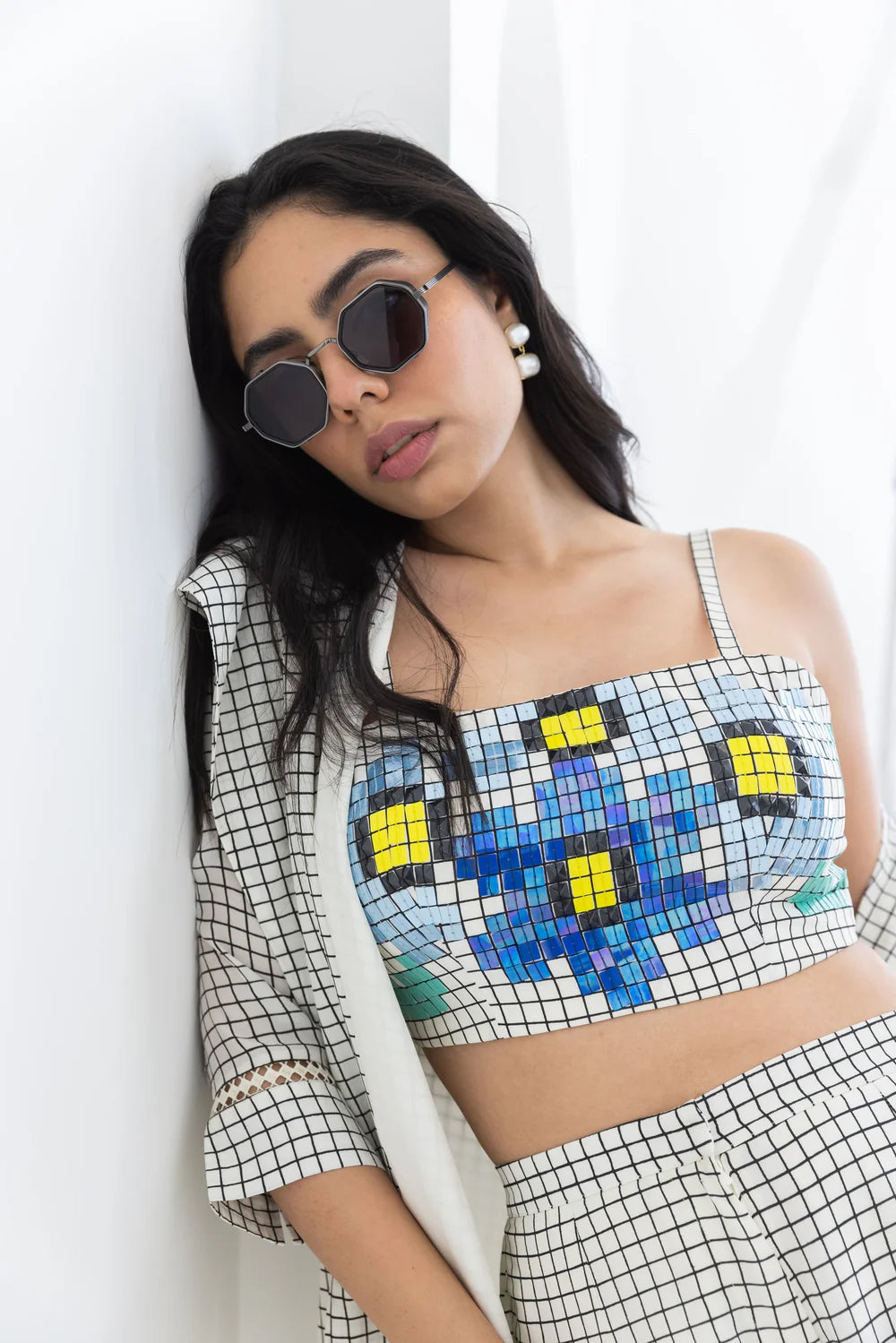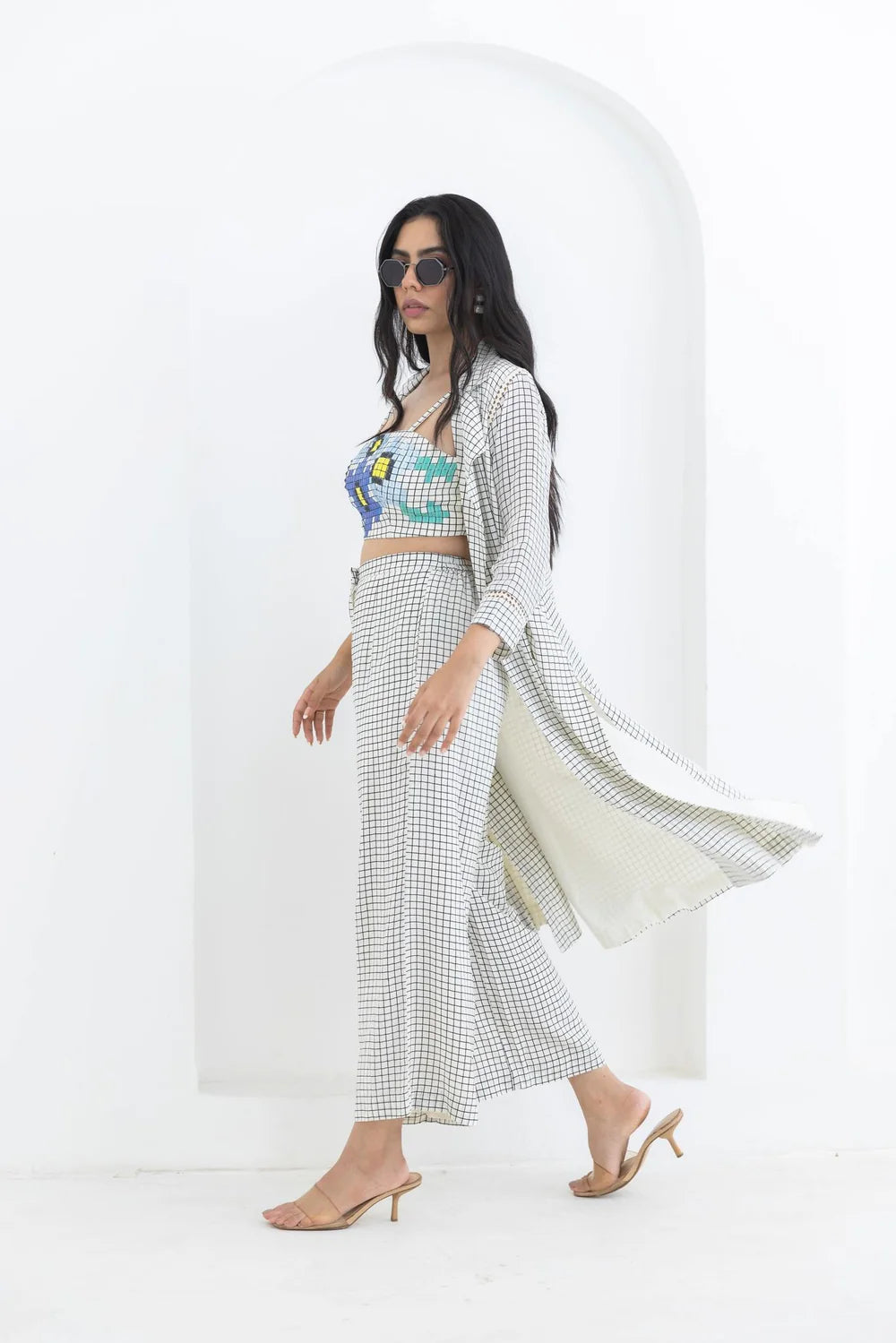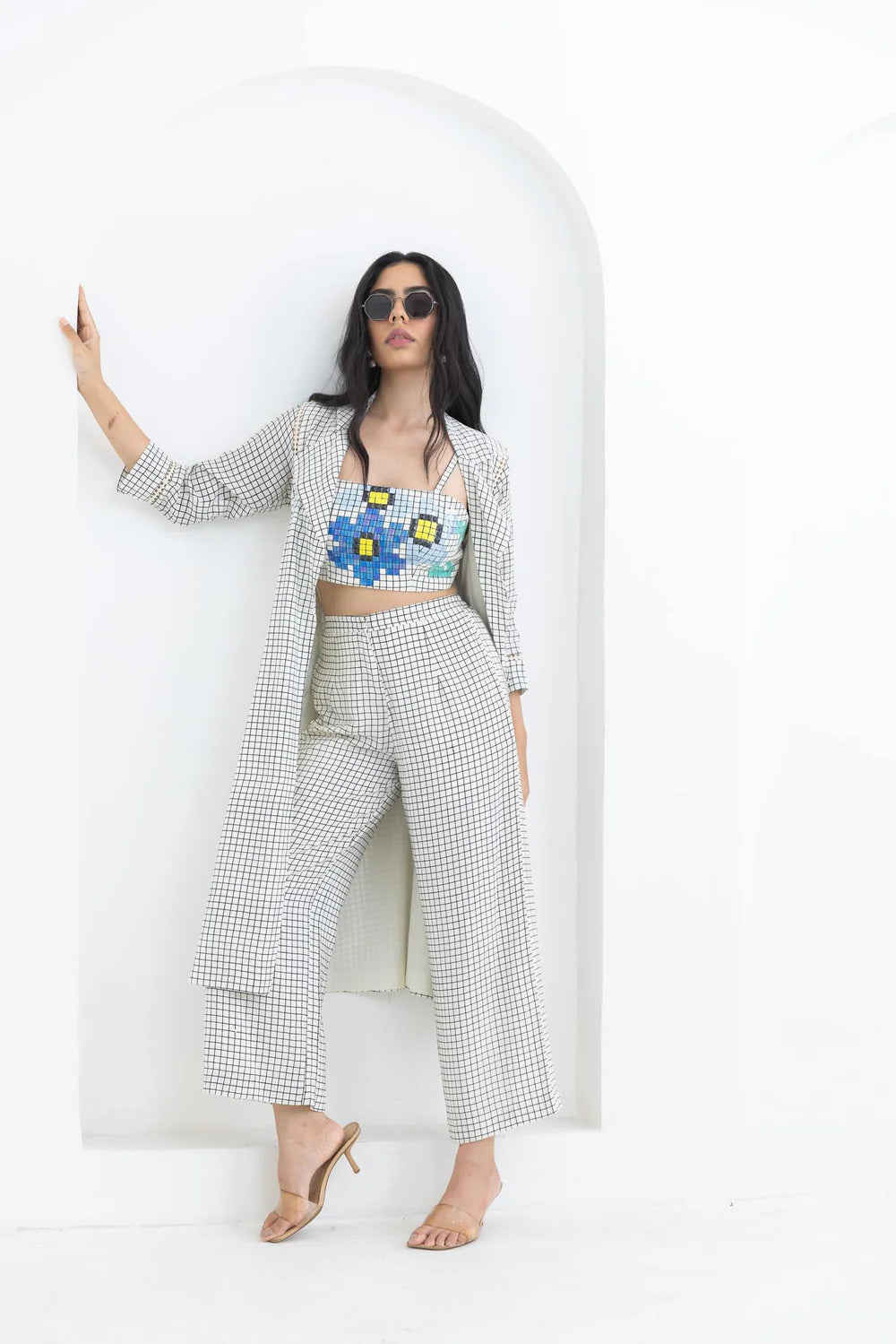 This powerful three-piece ensemble blends architectural geometry with handcrafted soft detail. Tailored from custom-print off-white crepe, it includes a structured longline jacket with sculptural cutwork at the sleeves, a hand‑embroidered bustier beneath, and printed cigarette-fit trousers—each piece balancing form and fluid artistry