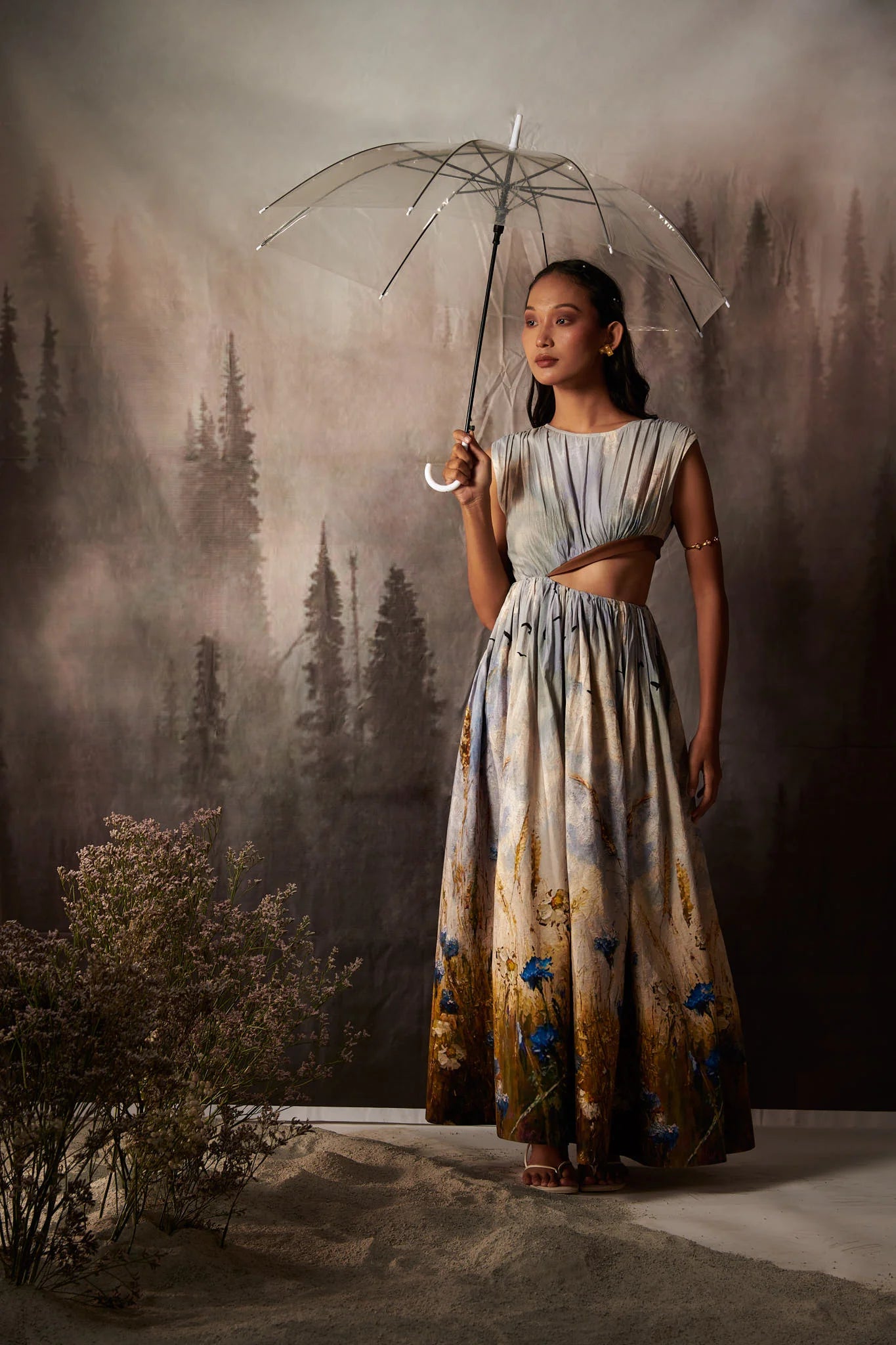The Whispers of the Meadow Dress is a canvas of misty hues and dreamlike blooms. With its soft pleated bodice, delicate cut-out at the waist, and a flowing skirt painted in earthy florals, this piece evokes the serenity of a twilight walk through sun-drenched fields.