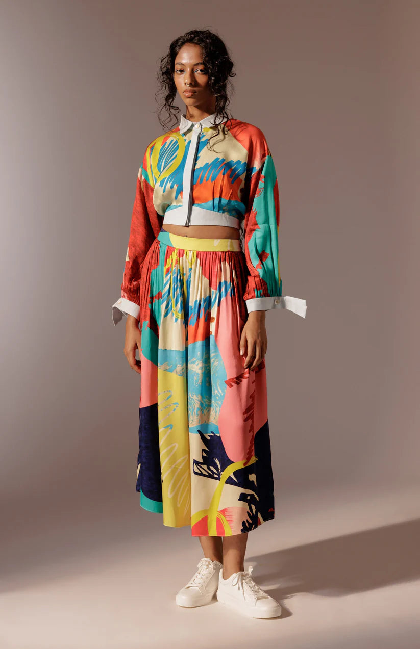 The Juno Gathered Skirt is a poetic fusion of bold artistry and feminine grace. Crafted in silky Bemberg satin twill, its vivid abstract print flows effortlessly with every step — evoking the rhythm of modern expression and timeless craftsmanship.