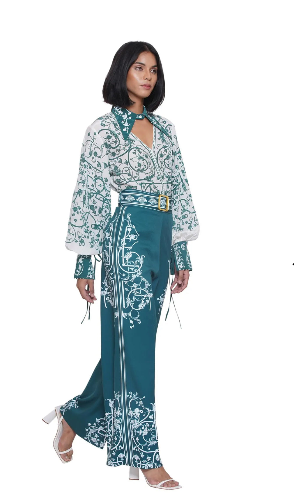 Rendered in structured crepe, these trousers offer more than shape—they embody visual poetry. Bold vertical placement prints grace the sides, inspired by vibrant Gond art traditions, infusing cultural narrative into modern form. A coordinating belt cinches the waist for sculpted ease, while the wide-leg silhouette drapes with tranquil sophistication. These are pants designed not just to be worn, but to be felt.