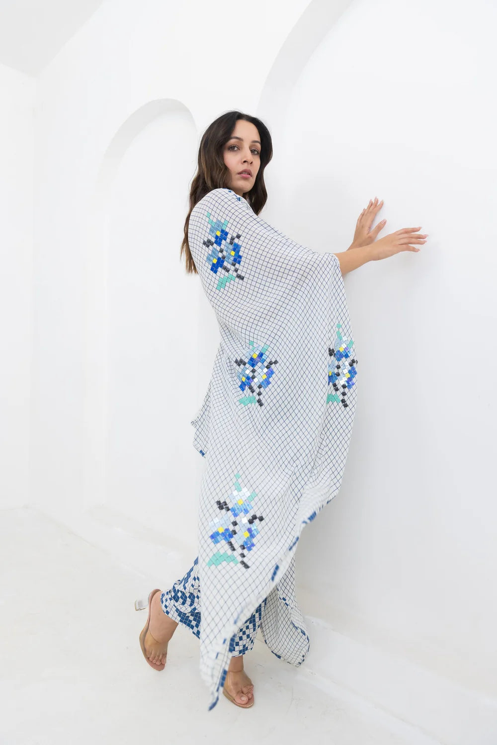 This striking two-piece ensemble marries sculptural tailoring with artisanal detail. The structured one-shoulder top is cut from off-white crepe and encircled with delicately hand-embroidered floral motifs, while frayed-edge detailing along the neckline softens the form. The coordinating trousers, printed in a subtle grid, echo the label’s signature geometric minimalism. Wear together for impact or separately to style with ease