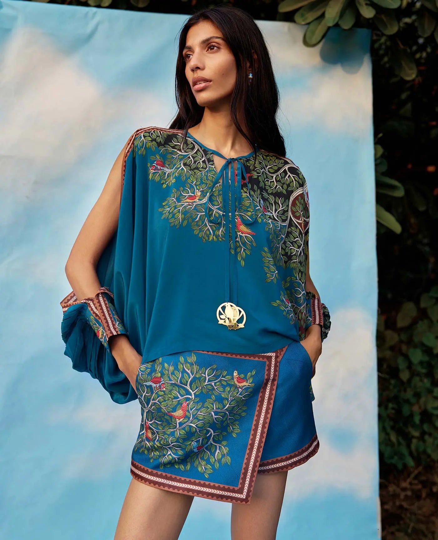 This top embodies a harmonious tension between relaxed tailoring and delicate storytelling. Cut on a balloon silhouette in fluid crepe, it features side-slit sleeves that gently float with movement. Each cuff is adorned with delicate hand embroidery, while a front tie with a soft tassel brings artisan charm to structural ease. The fabric’s Gond-art inspired placement print bridges heritage motifs with modern chic