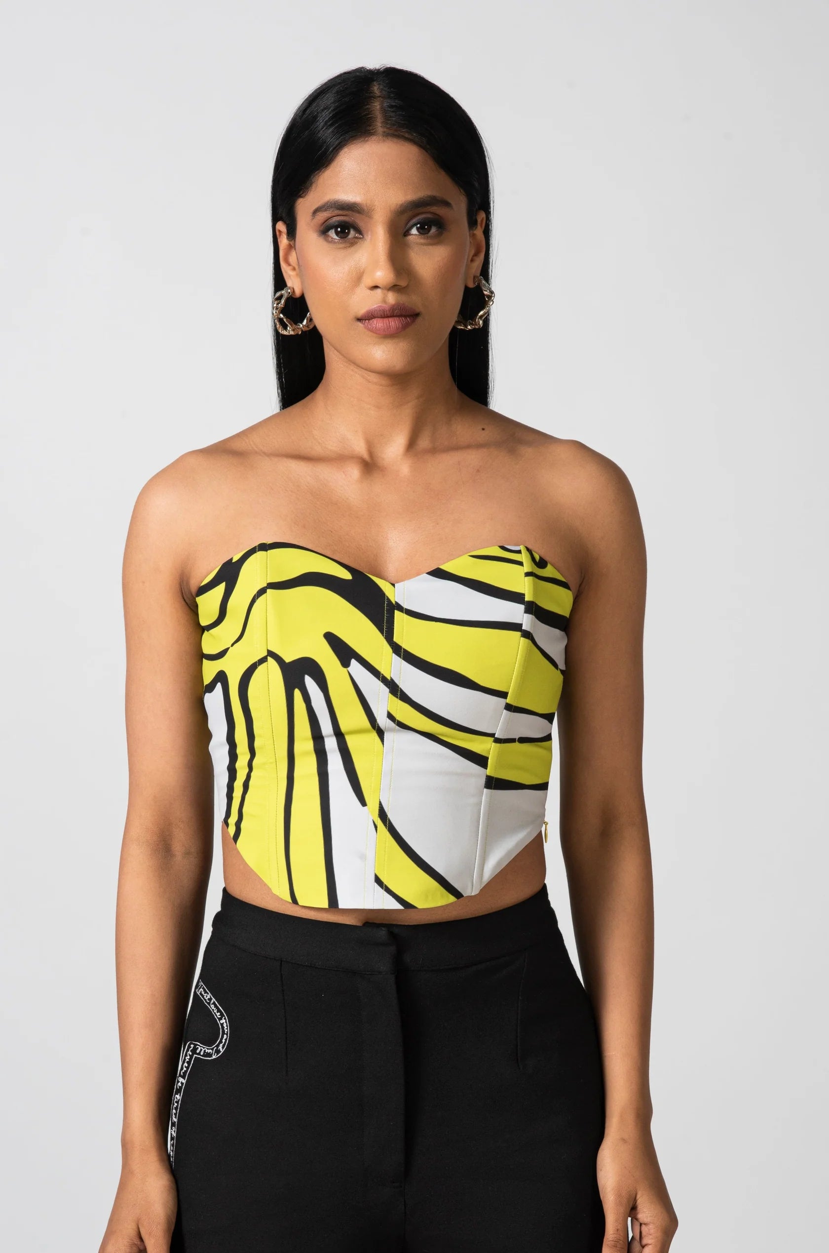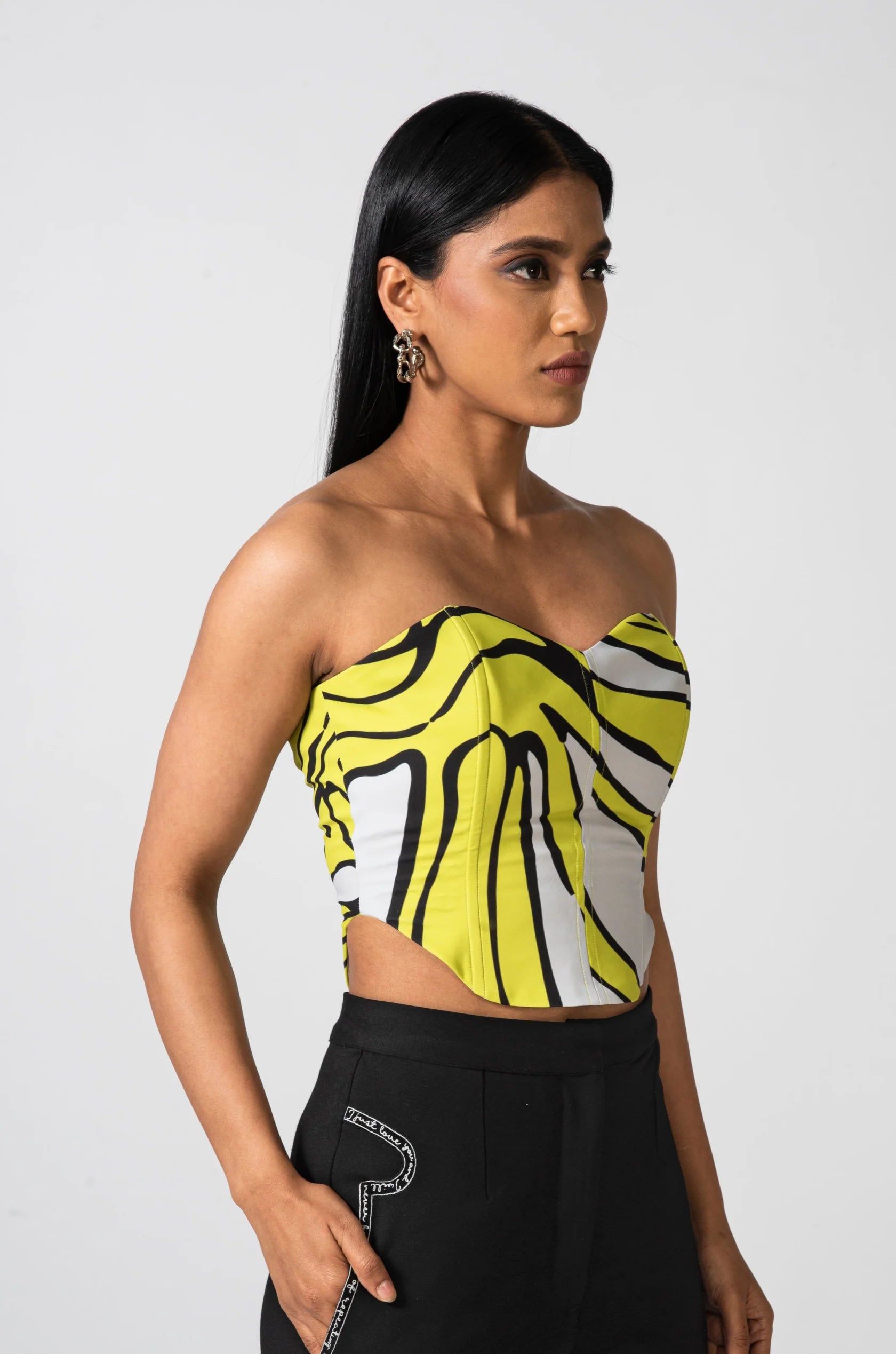 The Opulent Odyssey is more than a top—it’s a journey in silhouette. Crafted from luxury satin with an internal boning structure, its corseted bodice shapes the torso into an architectural masterpiece. Hand-printed painterly swirls in deep aubergine and gold tones add a sense of opulence, like a secret whispered in high esteem.