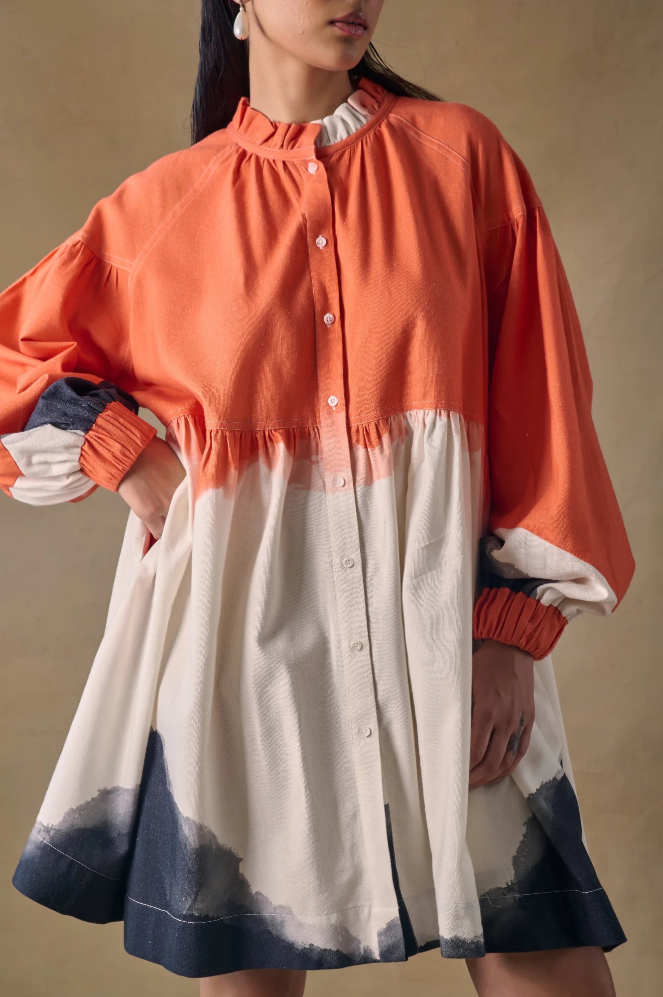 Embrace the essence of effortless elegance with the Orange Washed Gathered Dress—a harmonious blend of traditional craftsmanship and contemporary design. Crafted from breathable cotton flex fabric, this mini dress features a hand-drawn orange washed print that exudes warmth and vibrancy. The dress showcases a flattering silhouette with a ruffle collar and a back drawstring for adjustable shaping, offering both comfort and sophistication.