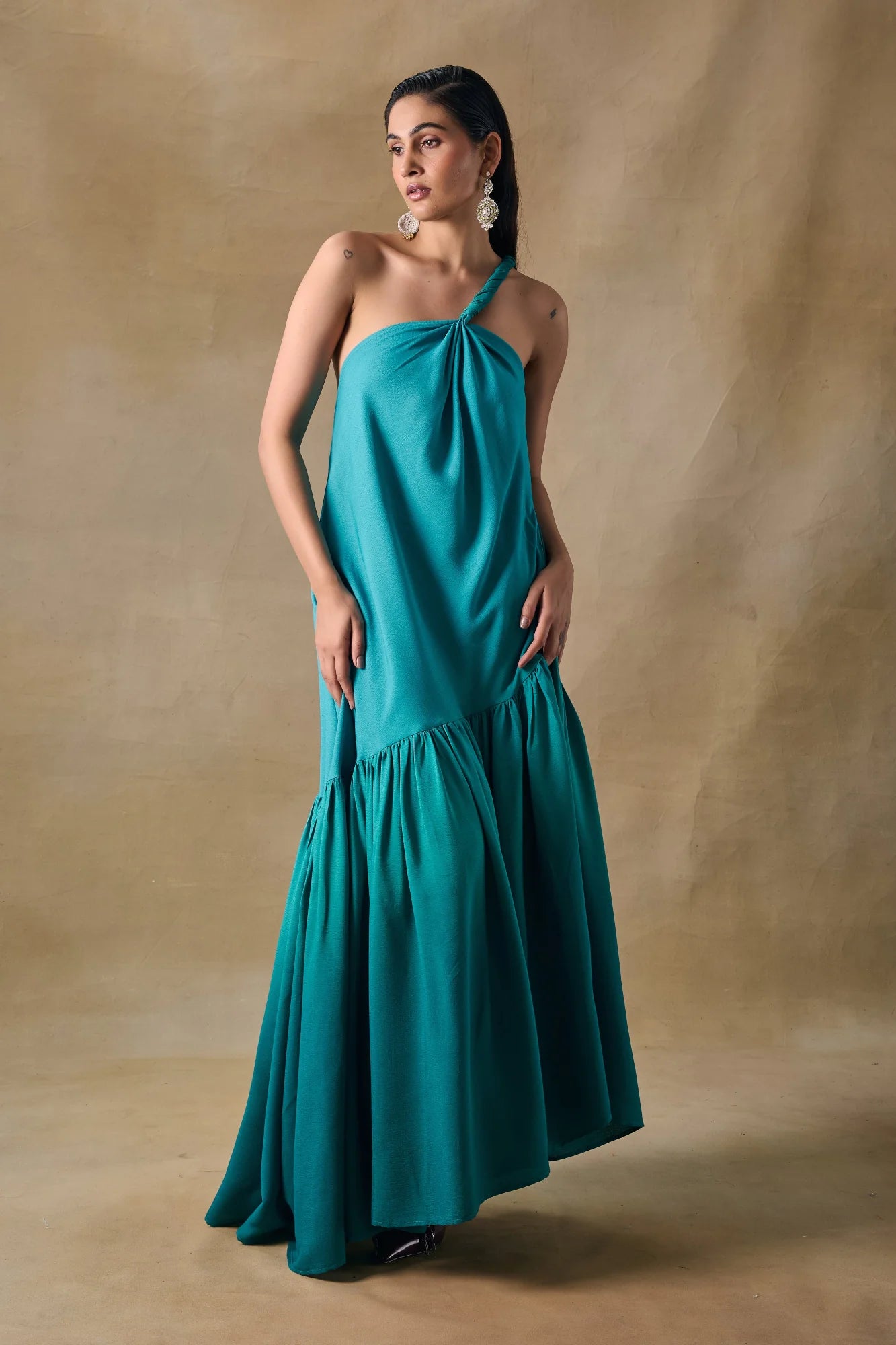 The Palm Reverie Ruffle Dress is an ode to relaxed glamour. Rendered in a lush, oceanic teal hue, this one-shoulder stunner features a softly gathered neckline and a dramatic, voluminous ruffle hem that sways with every step.