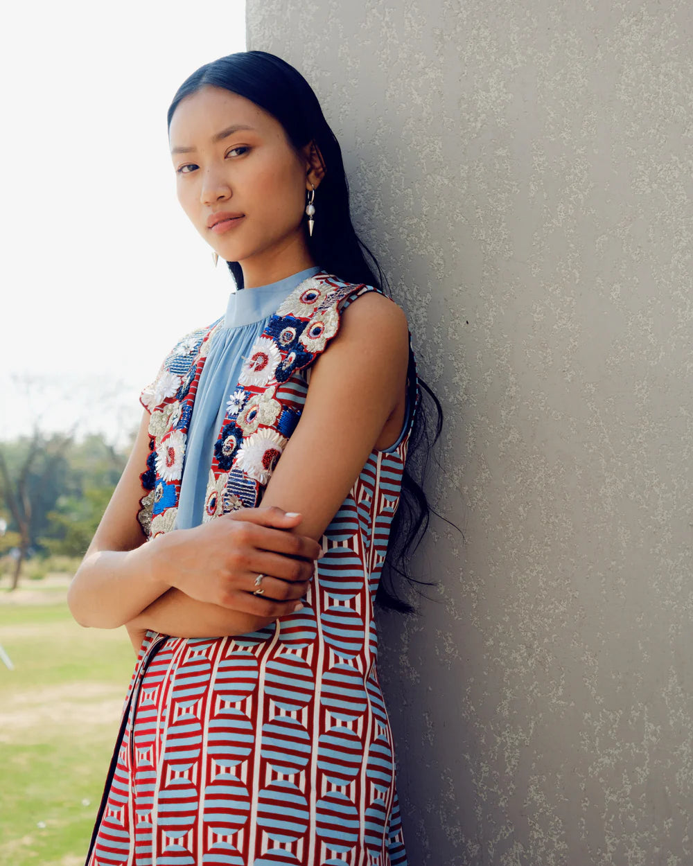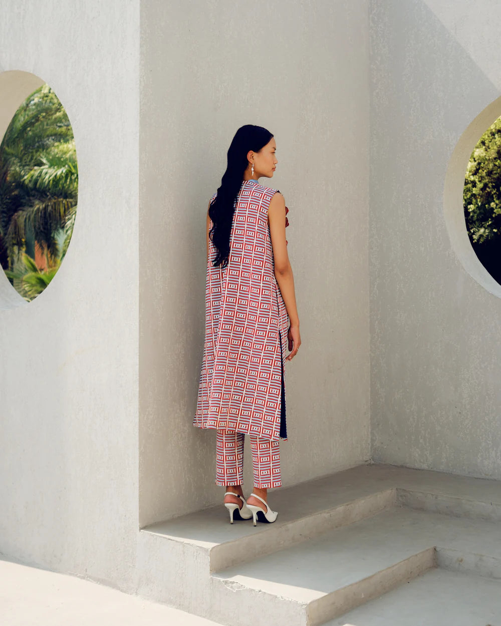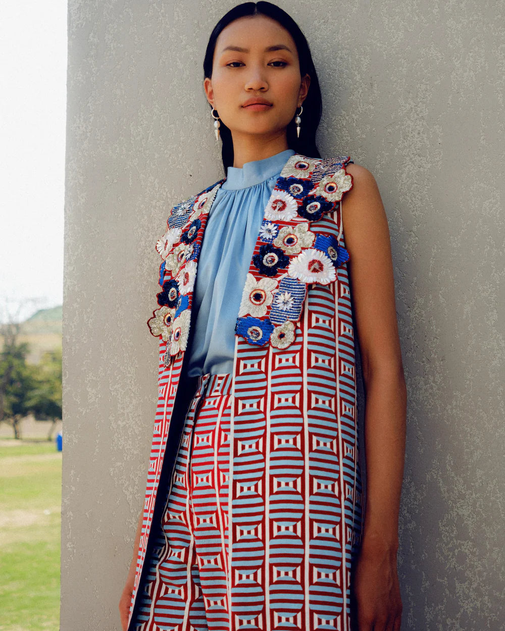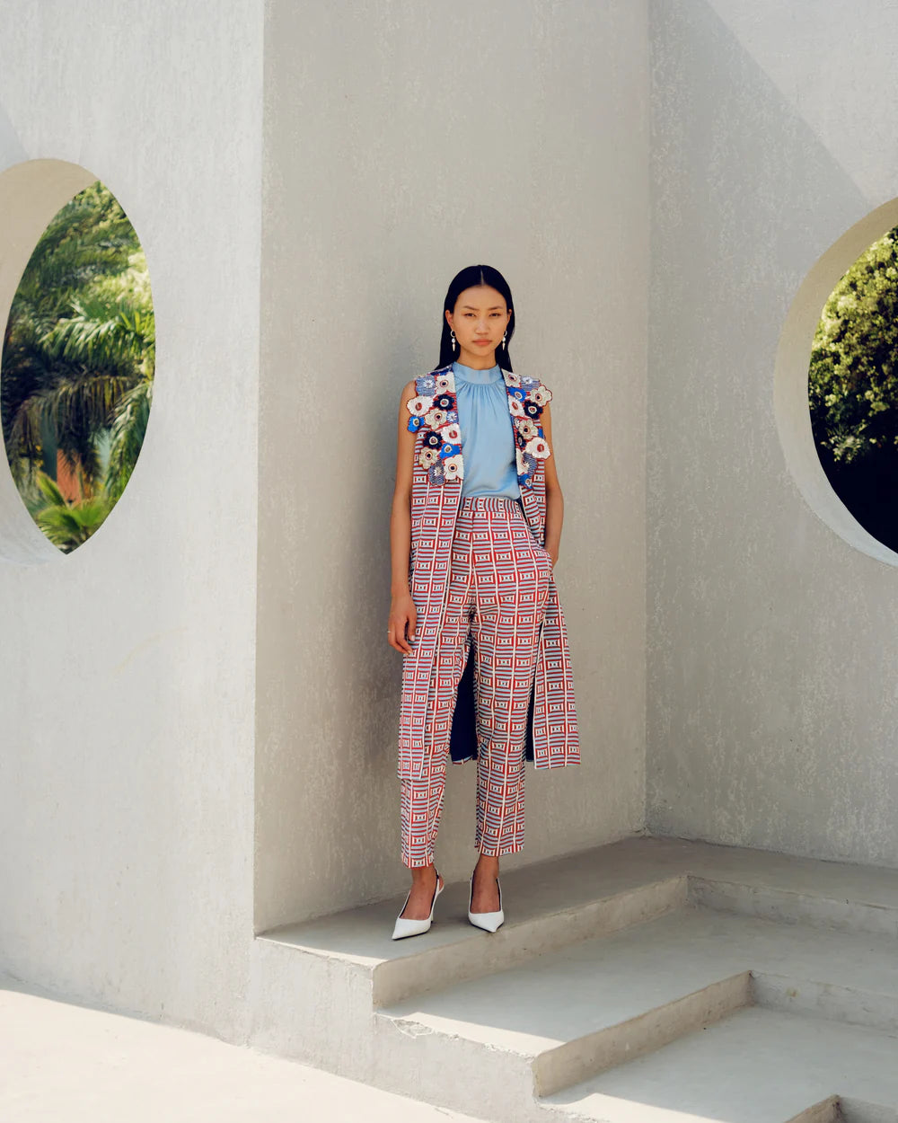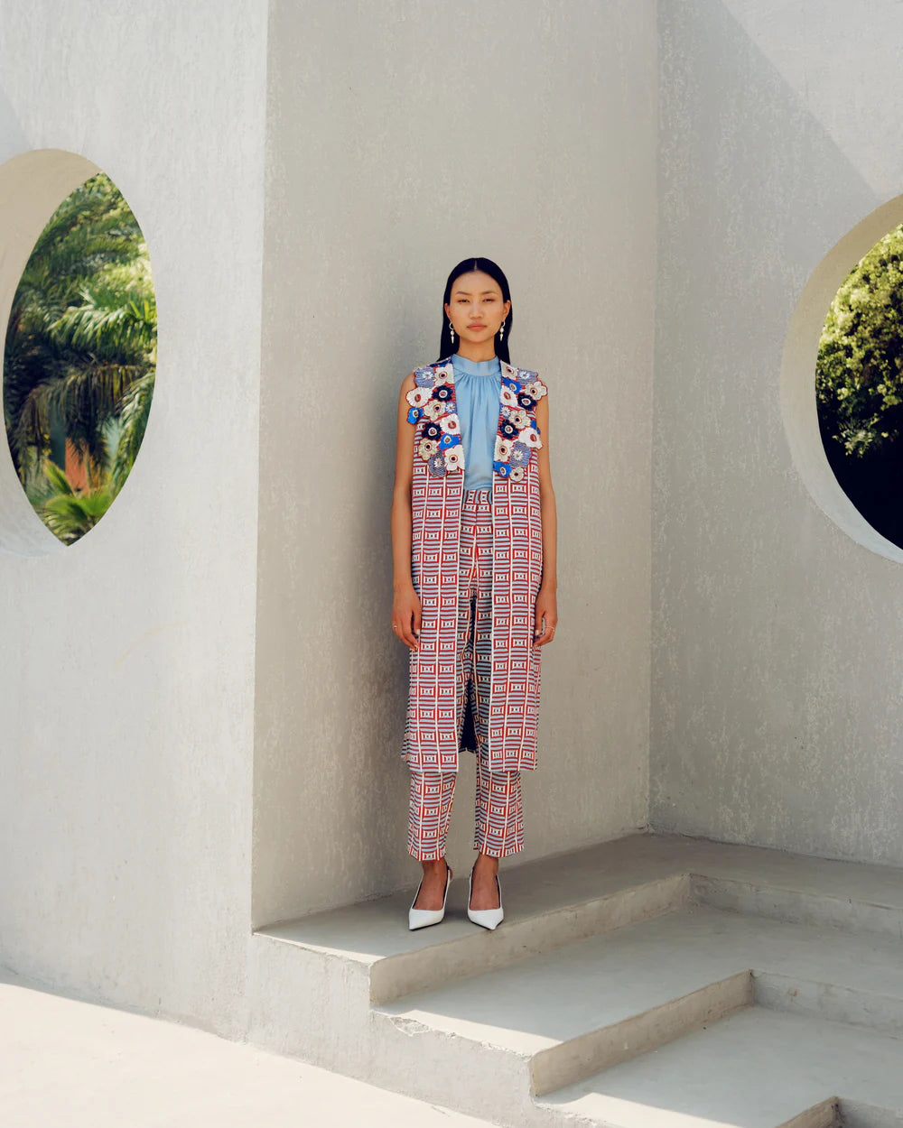An elegant ensemble painted in deepest rouge, inspired by floral whispers and modern tailoring.