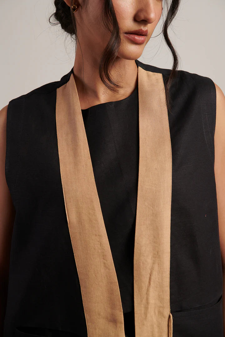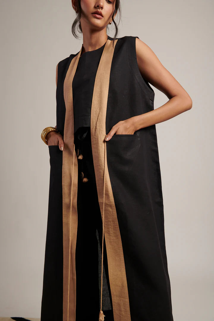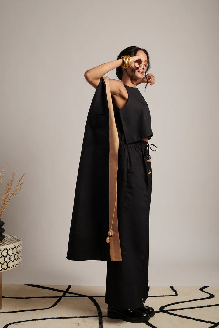 The set includes three coordinated pieces: a crop top, straight‑leg trousers, and a flowing overlay with a suggester of movement. The linen fabric gives this trio a breathable clarity, while the tassel tie‑up detail and contrasting front panel on the overlay add a sculptural poise that makes it more than just a set—it’s a quietly commanding look