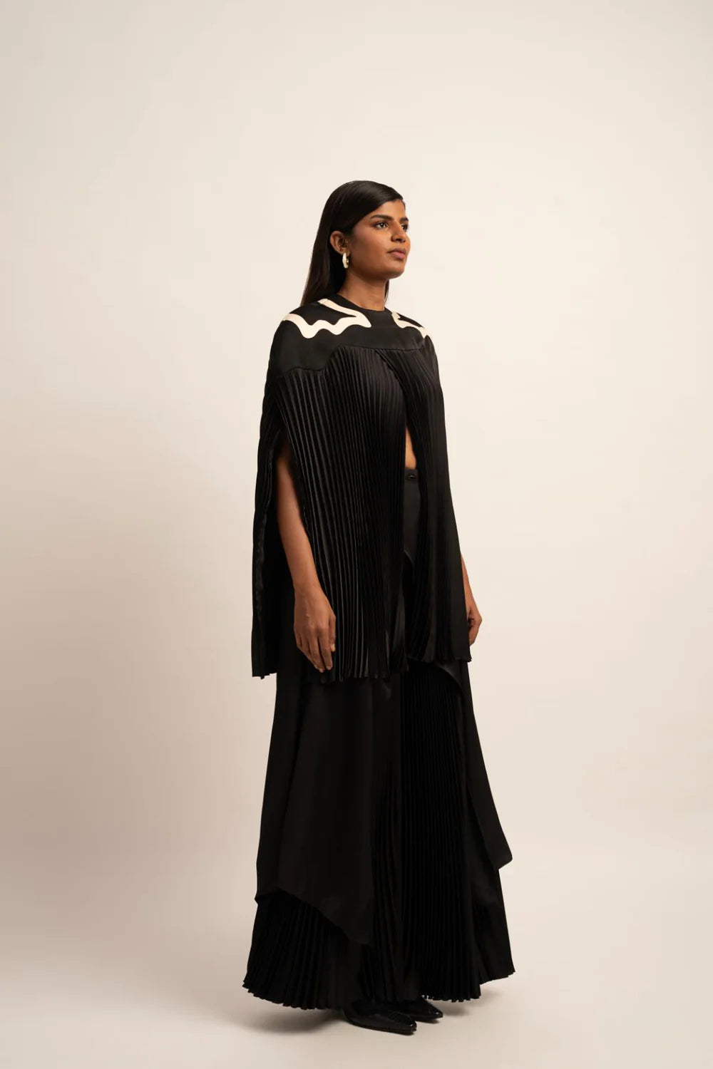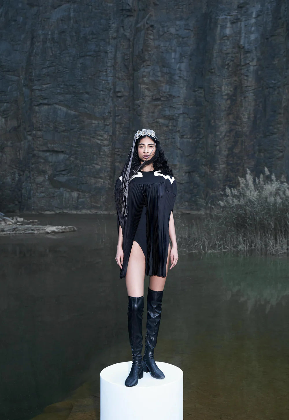 Crafted from luxuriant Japanese satin, the Swallowtail Top is a landmark of sartorial elegance. Black sun-ray pleating cascades from structured shoulders, creating a sculptural silhouette that moves with graceful intention. Shoulder panels are adorned with abstract white applique embroidery—delicate hands of modern artistry caressing the form. Designed to flatter all body types in its relaxed yet structured fit, it’s ideal for curated daywear or refined evening moments