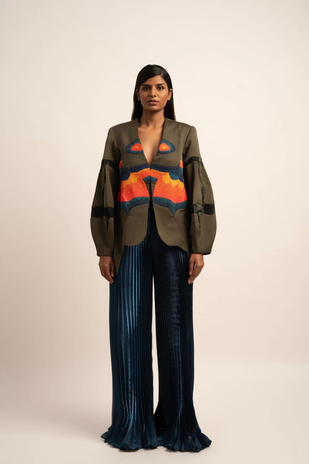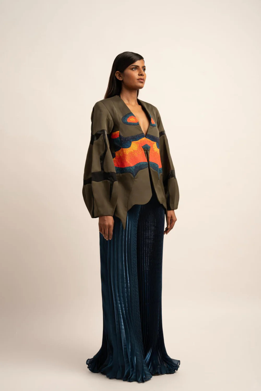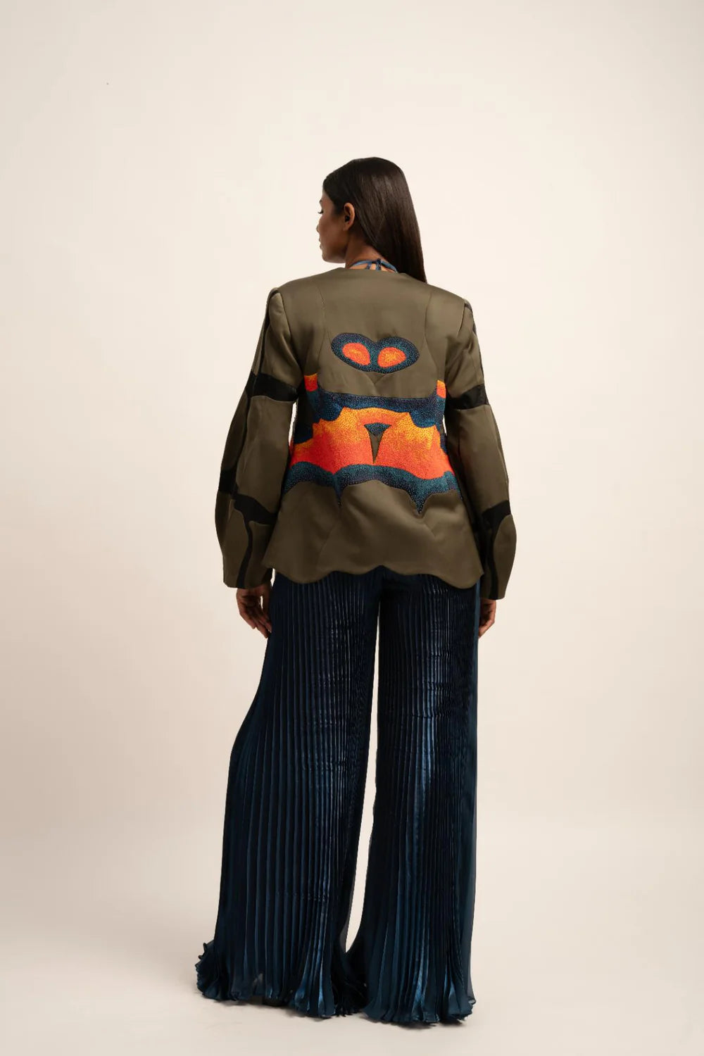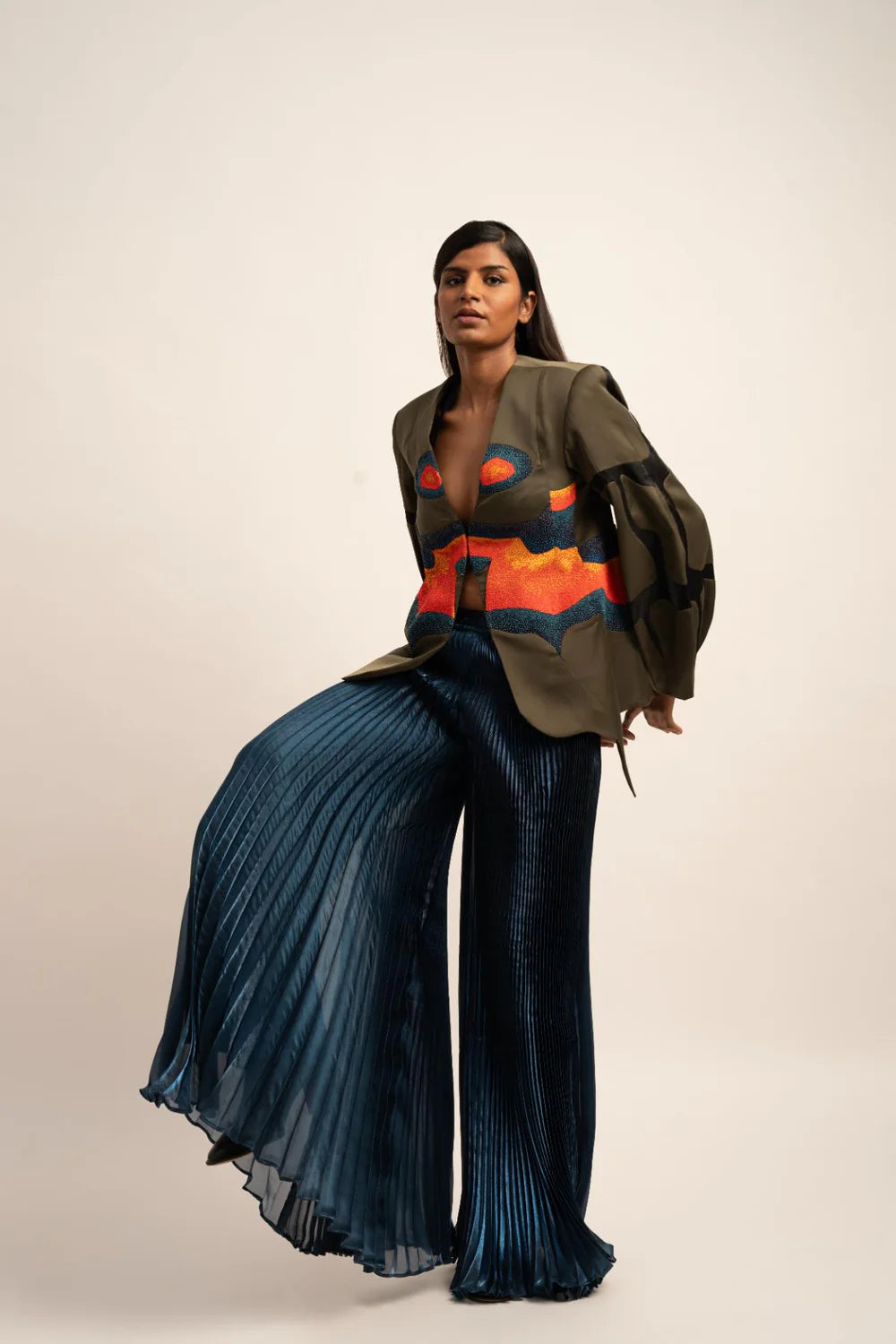 Crafted in deep teal fluid organza, these trousers embody the luminous translucence of liquid glass. Sunrise-style pleating creates meticulously textured folds that ripple softly with every movement—resulting in an ultra-wide leg silhouette that feels simultaneously sculptural and weightless. Whether gracing upscale events or refined evenings, they make a quietly bold statement