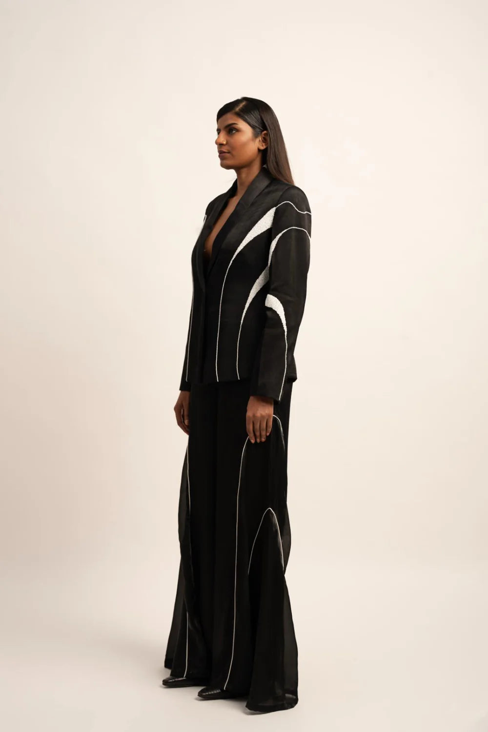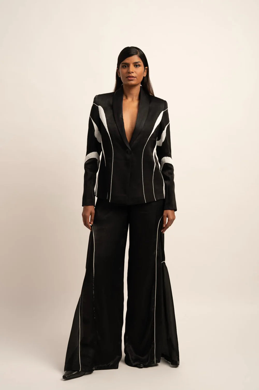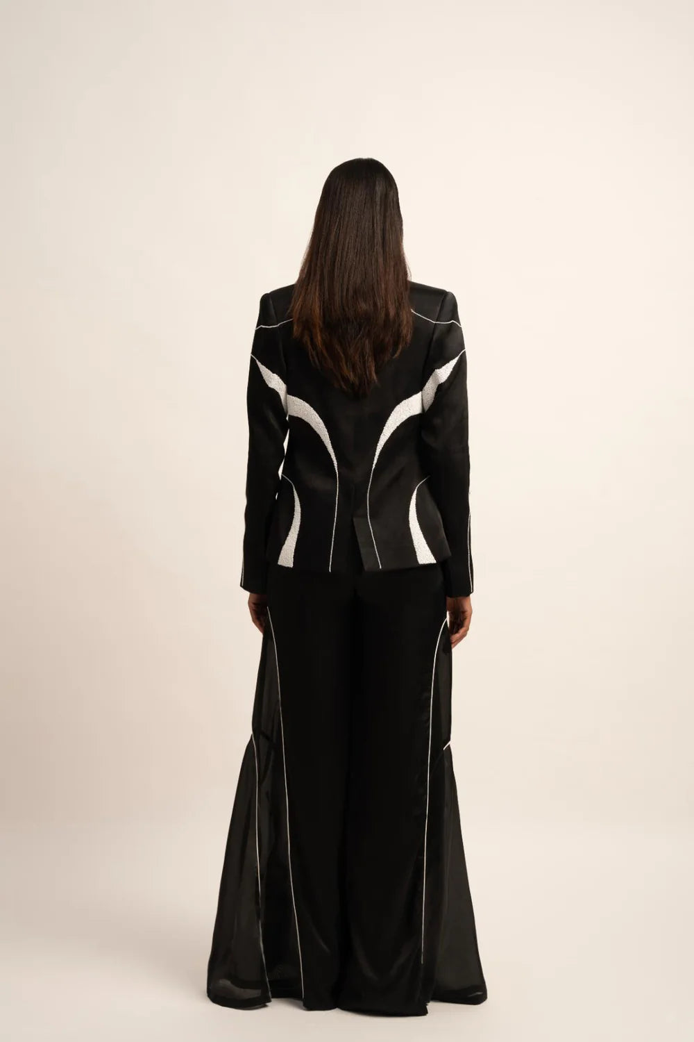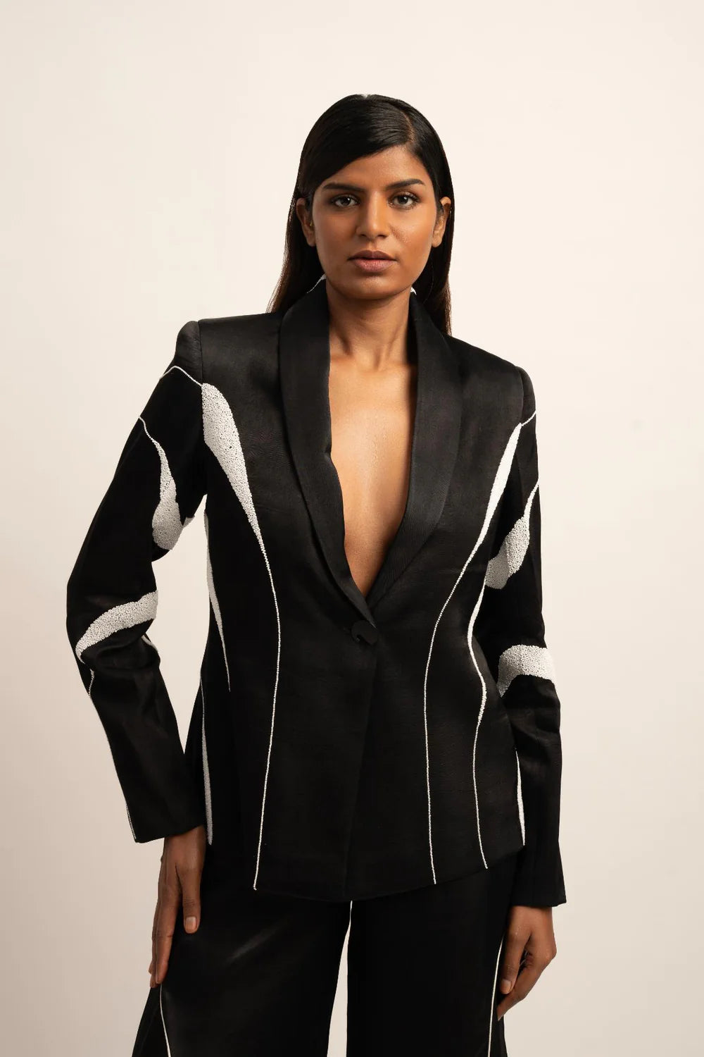 This pièce de résistance blazer is tailored in deep black viscose moss satin, tailored to a graceful silhouette that sits clean at the waist. Abstract hand‑placed white beaded embroidery traces and enhances the body’s natural curves, creating a mirage-like interplay between geometry and flow. It's sleek, sculpted, and artful—ideal for black-tie evenings, gallery premieres, or elevated city moments.