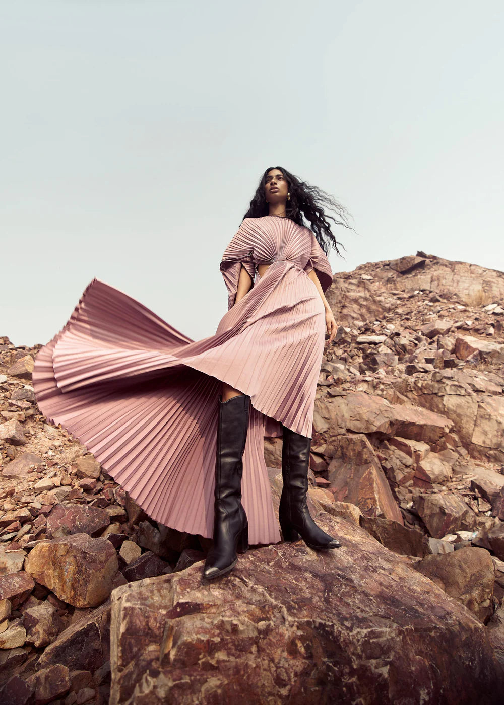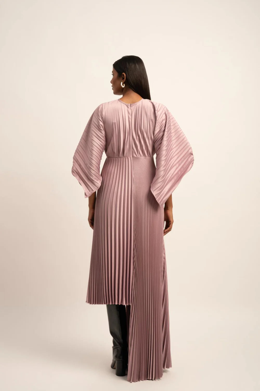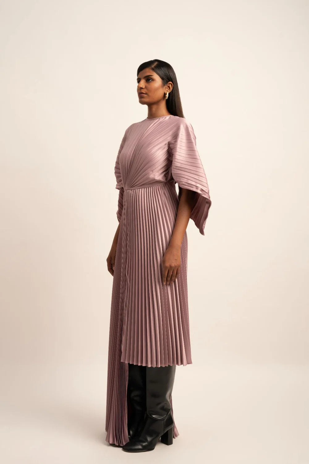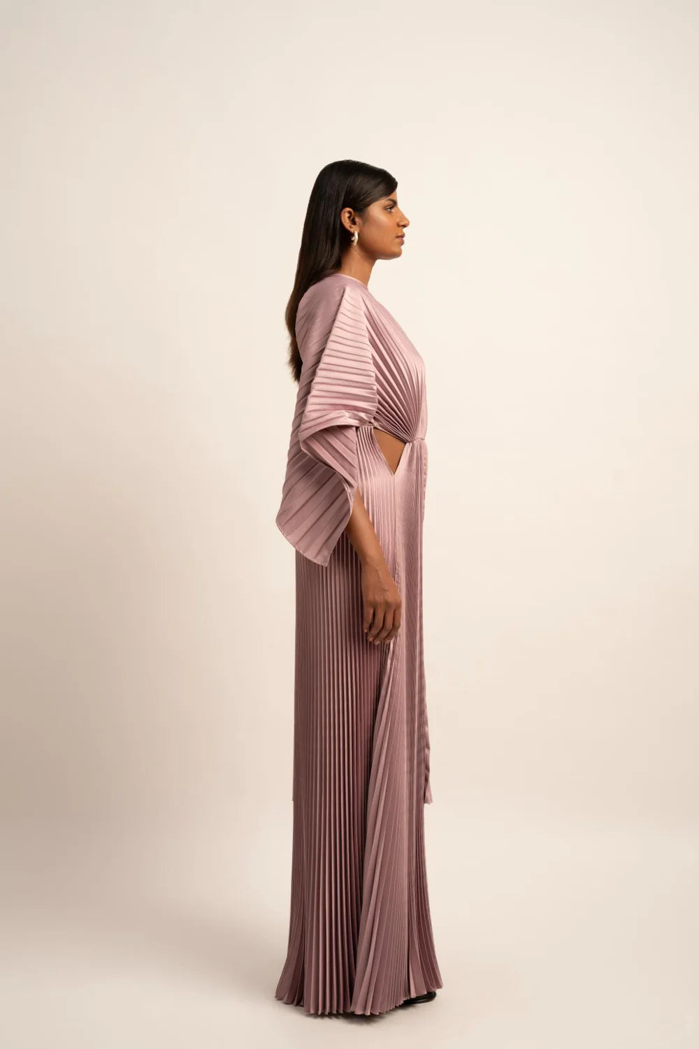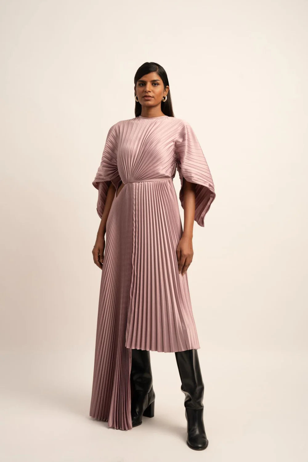 Cut in a romantic dusky rose hue, this sculptural dress transforms simplicity into art. Crafted from luxe satin crepe, its pleated construction sculpts the body with graceful movement and ease. The exaggerated silhouette flares from a cinched bodice into a voluminous drape—reminiscent of couture origami yet effortlessly wearable.