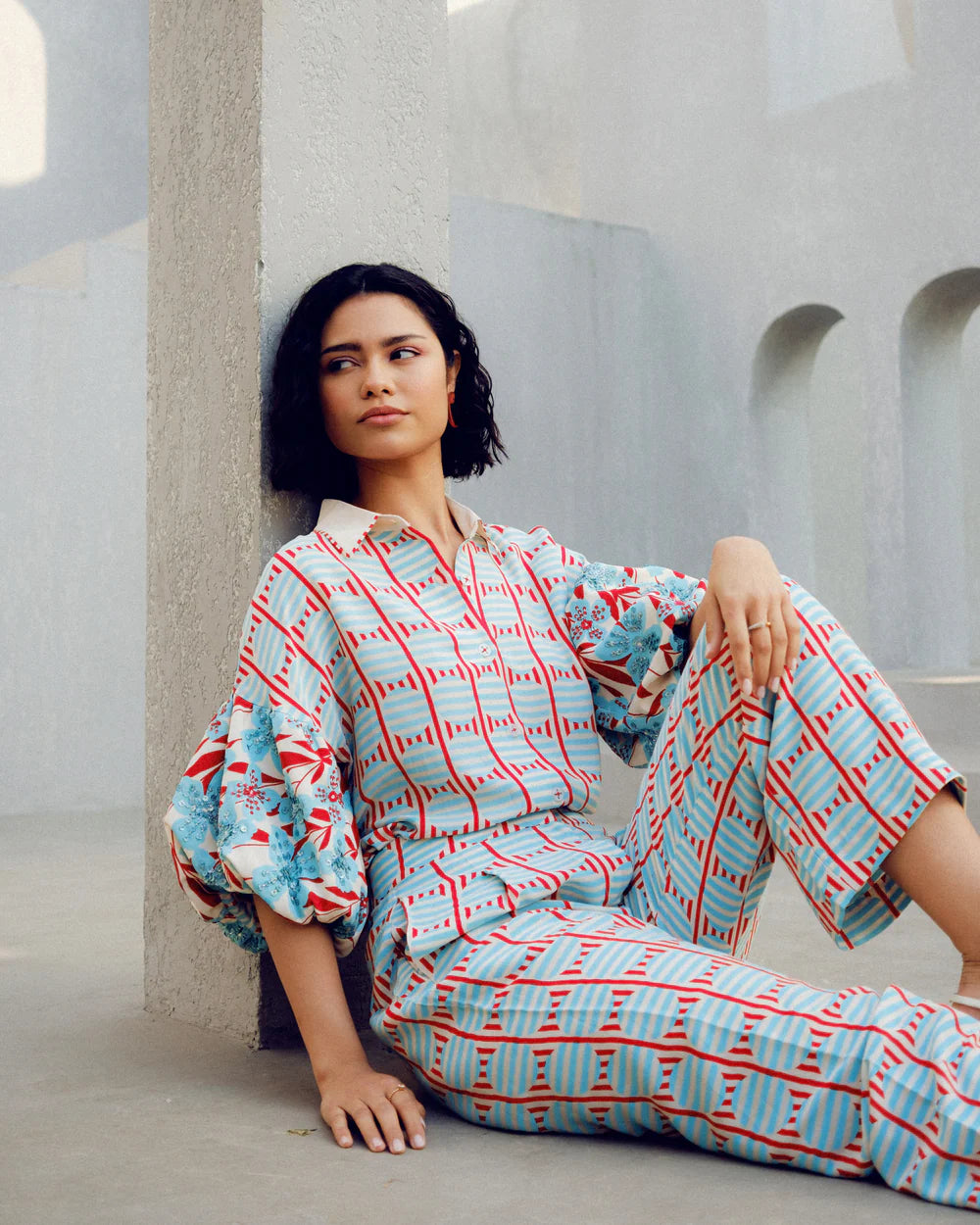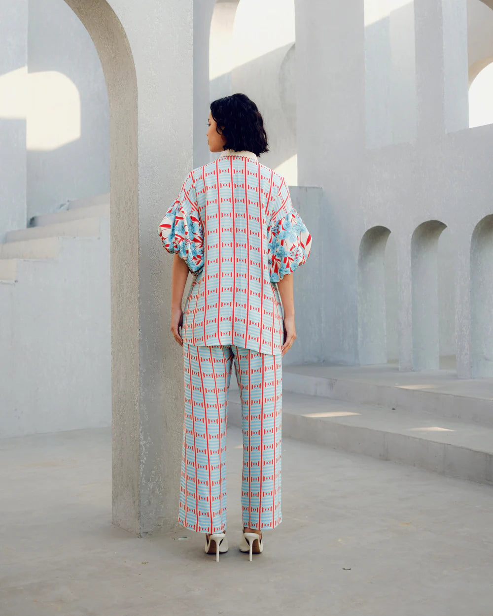 The Orange Ripple Blouse dances with energy—tailored from breathable double georgette and kissed with an abstract ripple print in warm sunset hues.