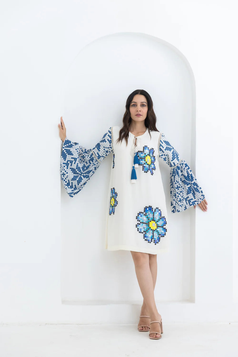 This off-white crepe shift dress is adorned with floating sunflower appliqués that cascade across the front, while sleeves bloom with cut-work lace and gentle gathers. A tassel drawstring neckline adds handcrafted detail to the otherwise clean silhouette—balancing whimsy and architectural ease