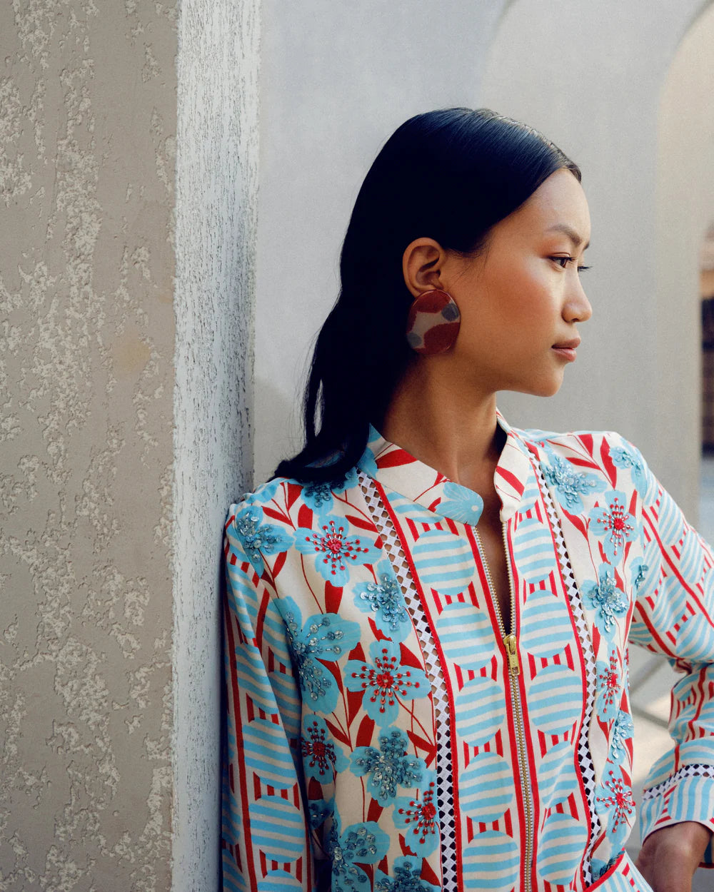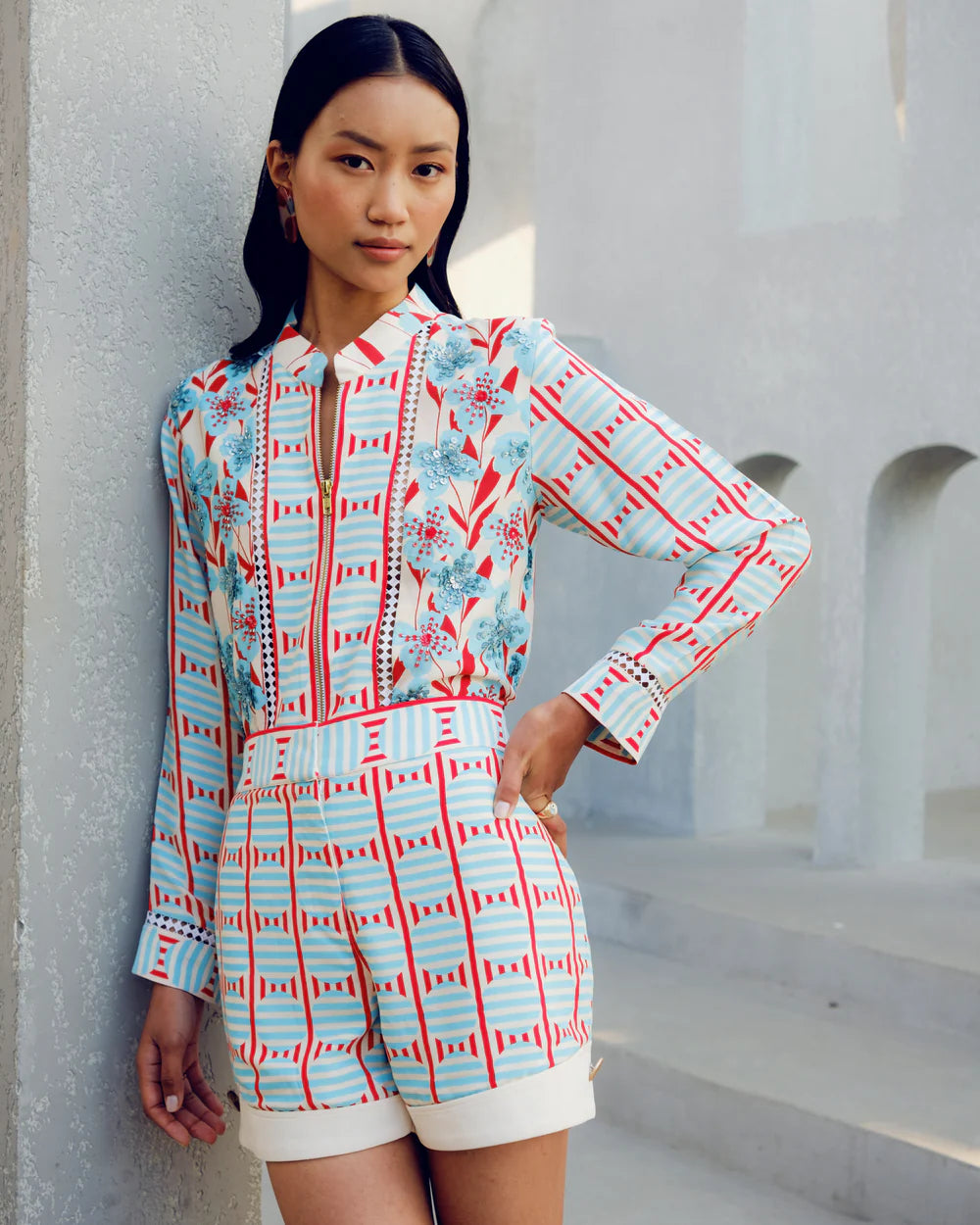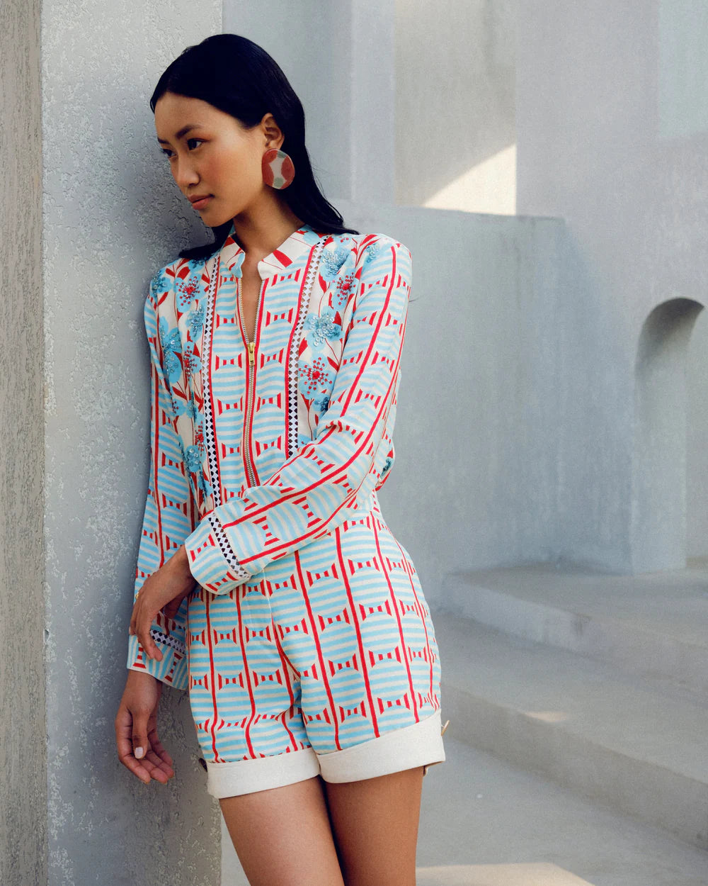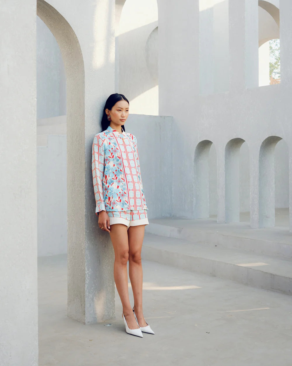This off-white White Zip Shirt is tailored from fluid double georgette, featuring a sleek mandarin collar and a hidden front‑zip placket. Its asymmetric floral-geometric print echoes PRG’s signature blend of modern artistry and heritage craftsmanship. The relaxed silhouette skims the body effortlessly, offering airy comfort without compromising on poise — a wearable pause in movement