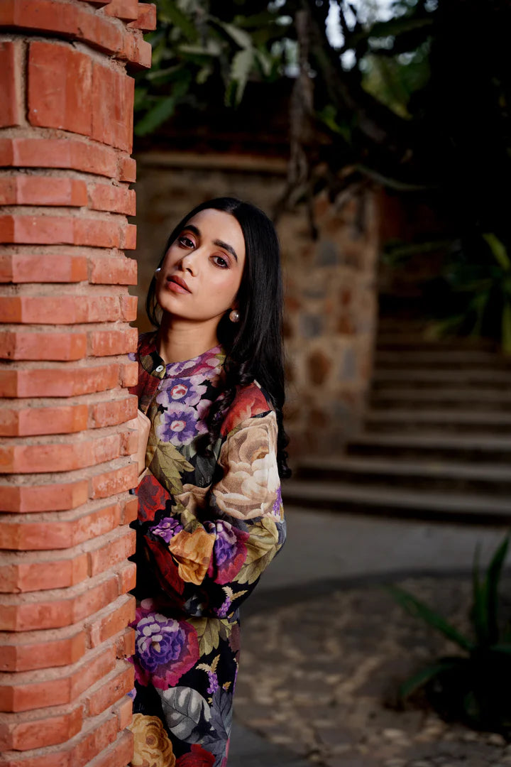 Bold florals meet winter‑rich texture.